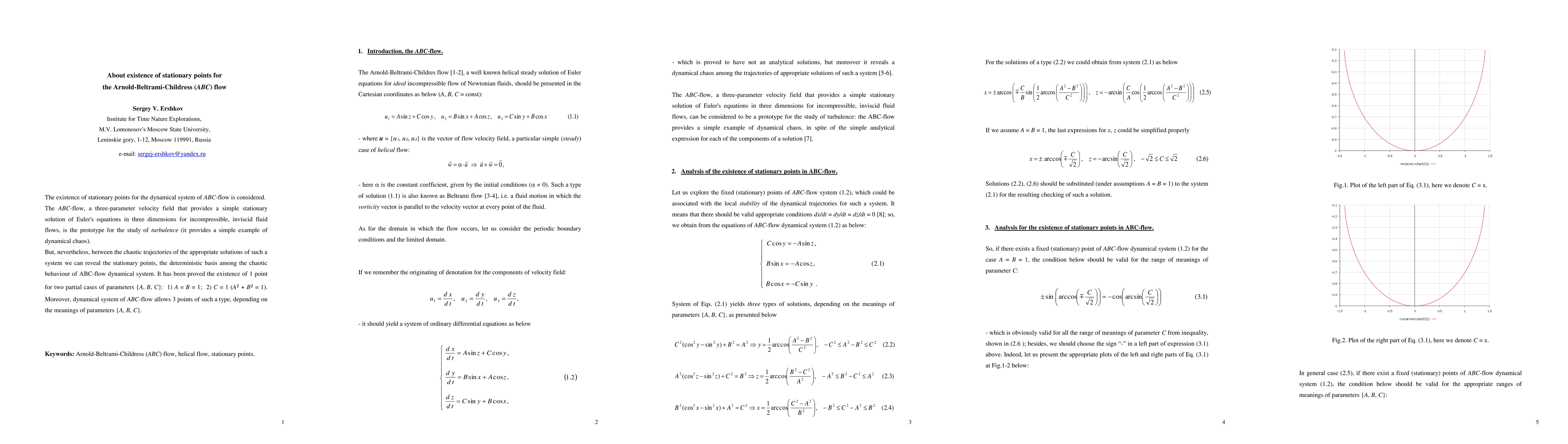 The existence of stationary points for the dynamical system of ABC-flow is considered. The ABC-flow, a three-parameter velocity field that provides a simple stationary solution of Euler's equations in three dimensions for incompressible, inviscid fluid flows, is the prototype for the study of turbulence (it provides a simple example of dynamical chaos). But, nevertheless, between the chaotic trajectories of the appropriate solutions of such a system we can reveal the stationary points, the deterministic basis among the chaotic behaviour of ABC-flow dynamical system. It has been proved the existence of 1 point for two partial cases of parameters {A, B, C}: 1) A = B = 1; 2) C = 1 (A^2 + B^2 = 1). Moreover, dynamical system of ABC-flow allows 3 points of such a type, depending on the meanings of parameters {A, B, C}.
