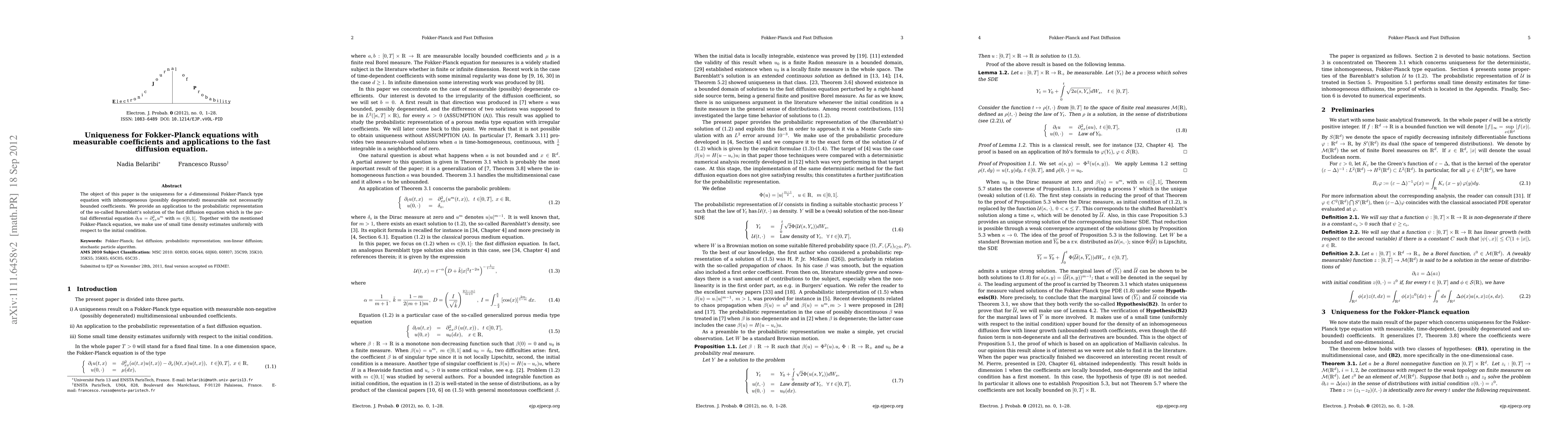 This paper explores the uniqueness of solutions for a $d$-dimensional Fokker-Planck equation with measurable, possibly degenerate coefficients. It applies this analysis to represent the Barenblatt solution of the fast diffusion equation probabilistically, utilizing small time density estimates.