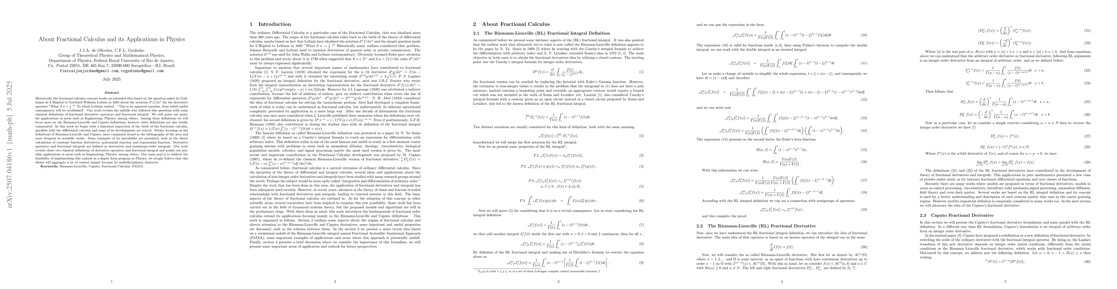 Historically the fractional calculus concept works an extended idea based on the question asked by Guillaume de L'H\^opital to Gottfried Wilhelm Leibniz in 1695 about the notation ${d^nf}/{dx^n}$ for the derivative operator "What if $n=\frac{1}{2}$ ?" To which Leibiniz replied : "This is an apparent paradox, from which useful consequences will be established". Our work revisits the unfolds who followed this questions with some classical definitions of fractional derivative operators and fractional integral. We still point out possible applications in areas such as Engineering, Physics, among others. Among these definitions we will focus more on the Riemann-Liouville and Caputo definitions, however other definitions are also briefly commented. In this work we begin with a historical inspection of the birth of the fractional calculus, parallels with the differential calculus and some of its developments are traced. Always focusing on the definitions of Riemann-Liouville and Caputo, more commonly found in the bibliography of the area and more frequent in scientific works. Some examples of its operability are presented, such as the direct calculation of constant function derivatives, polynomial function and exponential function. Derivative operators and fractional integrals are defined as derivatives and noninteger-order integrals. Our work revisits these two classical definitions of derivative operators and fractional integral and points out possible applications in areas such as Engineering, Physics, among others. Our main goal is to address the feasibility of implementing this content in a degree form program in Physics, we strogly believe that this theme will aggregate a lot of content mainly because its multidisciplinary character.