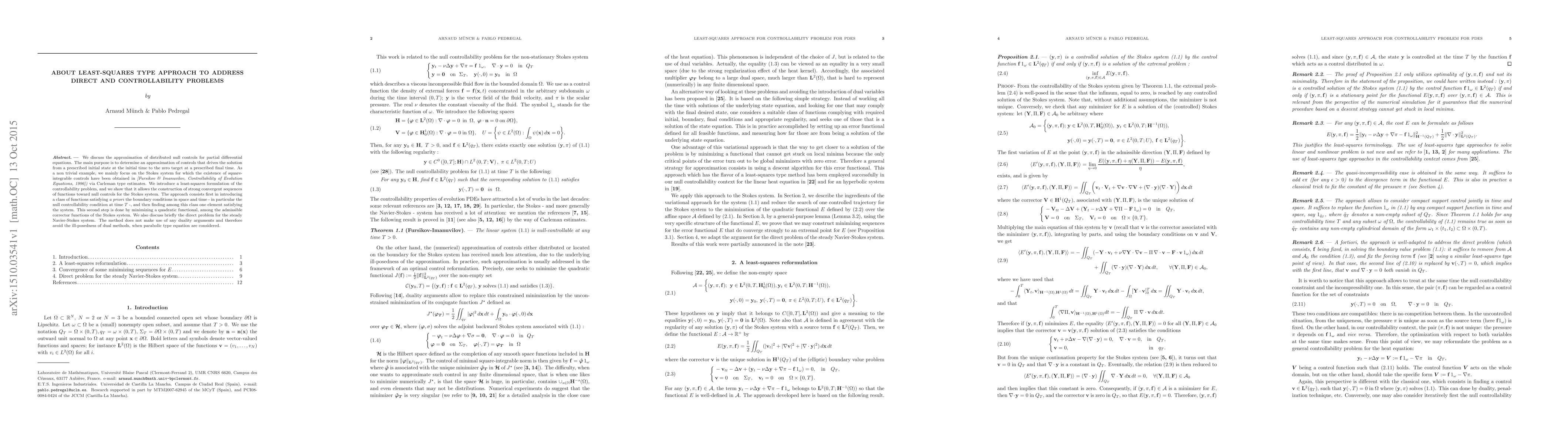 - We discuss the approximation of distributed null controls for partial differential equations. The main purpose is to determine an approximation of controls that drives the solution from a prescribed initial state at the initial time to the zero target at a prescribed final time. As a non trivial example, we mainly focus on the Stokes system for which the existence of square-integrable controls have been obtained in [Fursikov \& Imanuvilov, Controllability of Evolution Equations, 1996]) via Carleman type estimates. We introduce a least-squares formulation of the controllability problem, and we show that it allows the construction of strong convergent sequences of functions toward null controls for the Stokes system. The approach consists first in introducing a class of functions satisfying a priori the boundary conditions in space and time-in particular the null controllability condition at time T-, and then finding among this class one element satisfying the system. This second step is done by minimizing a quadratic functional, among the admissible corrector functions of the Stokes system. We also discuss briefly the direct problem for the steady Navier-Stokes system. The method does not make use of any duality arguments and therefore avoid the ill-posedness of dual methods, when parabolic type equation are considered.
