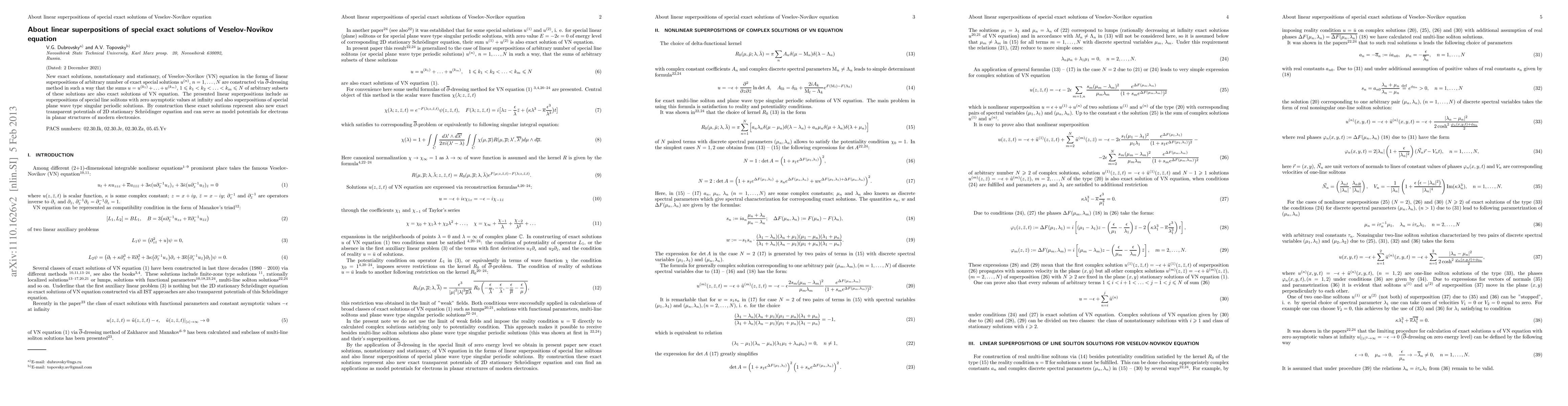 This paper constructs new exact solutions of the Veselov-Novikov equation using linear superpositions of special exact solutions via the $\bar\partial$-dressing method. These solutions include both nonstationary and stationary forms, and serve as new potentials for the 2D stationary Schrödinger equation, useful in modeling electrons in modern planar electronic structures.