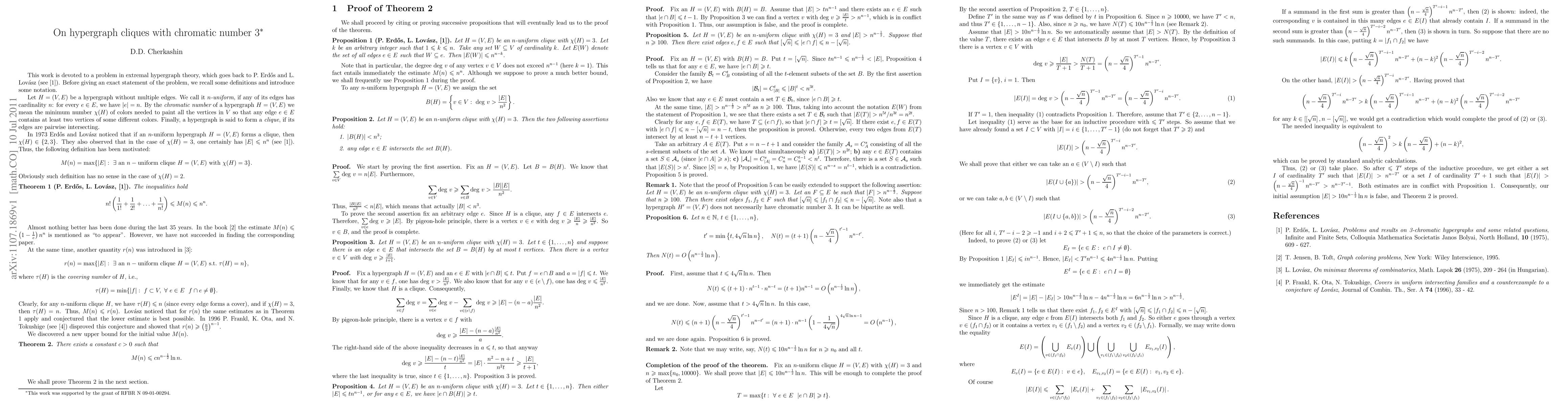Let $ H = (V,E) $ be a hypergraph. By the chromatic number of a hypergraph $ H = (V,E) $ we mean the minimum number $\chi(H)$ of colors needed to paint all the vertices in $ V $ so that any edge $ e \in E $ contains at least two vertices of some different colors. Finally, a hypergraph is said to form a clique, if its edges are pairwise intersecting. In 1973 Erd\H{o}s and Lov\'asz noticed that if an $n$-uniform hypergraph $ H = (V,E) $ forms a clique, then $ \chi(H) \in \{2,3\} $. They untoduced following quantity. $$ M(n) = \max \{|E|: \exists {\rm an} n-{\rm uniform} {\rm clique} H = (V,E) {\rm with} \chi(H) = 3\}. $$ Obviously such definition has no sense in the case of $ \chi(H) = 2 $. Theorem 1 (P. Erdos, L. Lovasz} The inequalities hold $$ n!(e-1) \le M(n) \le n^n. $$ Almost nothing better has been done during the last 35 years. At the same time, another quantity $ r(n) $ was introduced by Lovasz r(n) = \max \{|E|: ~ \exists {\rm an} ~ n-{\rm uniform} ~ {\rm clique} ~ H = (V,E) ~ {\rm s.t.} ~ \tau(H) = n\}, $$ where $ \tau(H) $ is the {\it covering number} of $ H $, i.e., $$ \tau(H) = \min \{|f|: ~ f \subset V, ~ \forall ~ e \in E ~ f \cap e \neq \emptyset\}. $$ Clearly, for any $n$-uniform clique $ H $, we have $ \tau(H) \le n $, and if $ \chi(H) = 3 $, then $ \tau(H) = n $. Thus, $ M(n) \le r(n) $. Lov\'asz noticed that for $ r(n) $ the same estimates as in Theorem 1 apply and conjectured that the lower estimate is best possible. In 1996 P. Frankl, K. Ota, and N. Tokushige disproved this conjecture and showed that $ r(n) \ge (\frac{n}{2})^{n-1} $. We discovered a new upper bound for the r(n) (so for M(n) too). Theorem 2. $$ M(n) \leq r(n) \le c n^{n-1/2} \ln n. $$, where c is a constant.