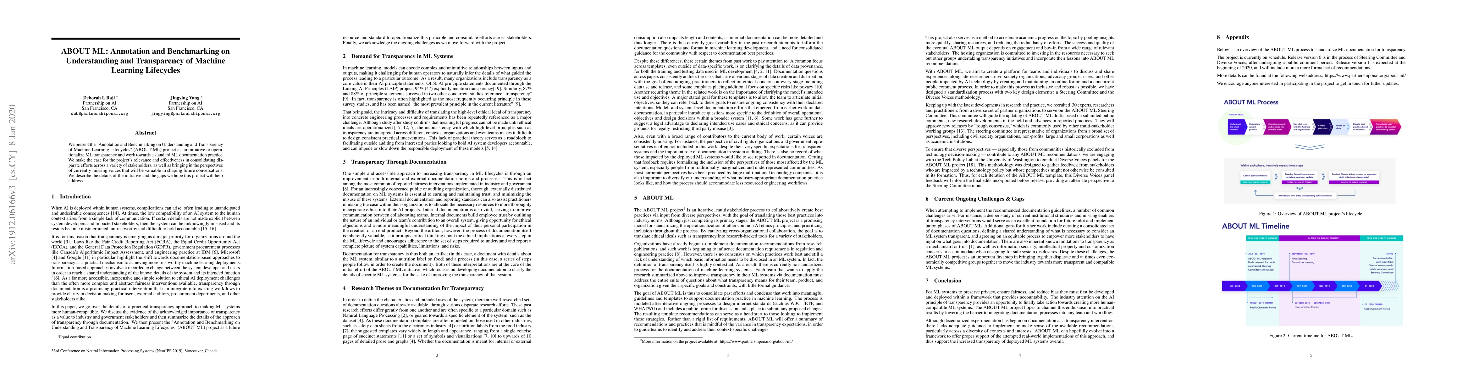 We present the "Annotation and Benchmarking on Understanding and Transparency of Machine Learning Lifecycles" (ABOUT ML) project as an initiative to operationalize ML transparency and work towards a standard ML documentation practice. We make the case for the project's relevance and effectiveness in consolidating disparate efforts across a variety of stakeholders, as well as bringing in the perspectives of currently missing voices that will be valuable in shaping future conversations. We describe the details of the initiative and the gaps we hope this project will help address.