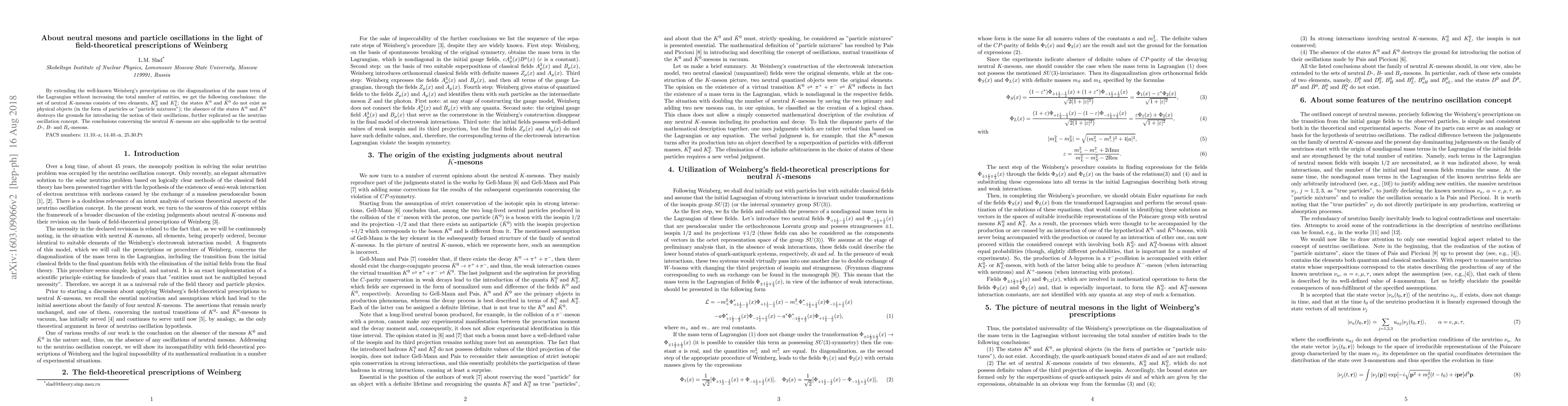 The paper reinterprets Weinberg's prescriptions, concluding that neutral K-mesons consist only of K_S^0 and K_L^0, without physical existence of K^0 and anti-K^0. This negates the basis for K^0-anti-K^0 oscillations, implying similar conclusions for D, B, and B_s mesons, challenging the neutrino oscillation concept.