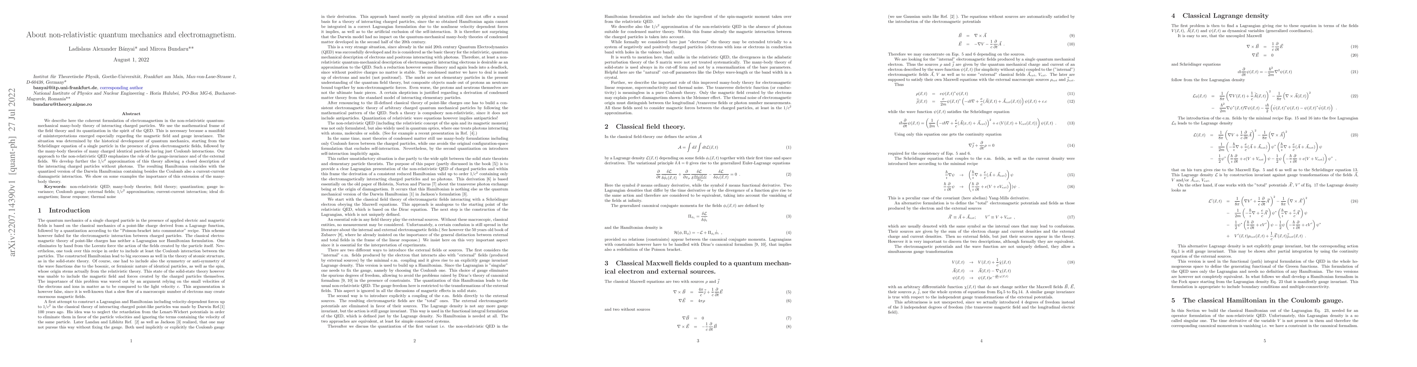 This paper presents a coherent formulation of electromagnetism within non-relativistic quantum mechanics for interacting charged particles, emphasizing gauge invariance and external fields. It develops a $1/c^2$ approximation leading to a Hamiltonian that includes both Coulomb and current-current diamagnetic interactions, highlighting its significance in many-body theory.