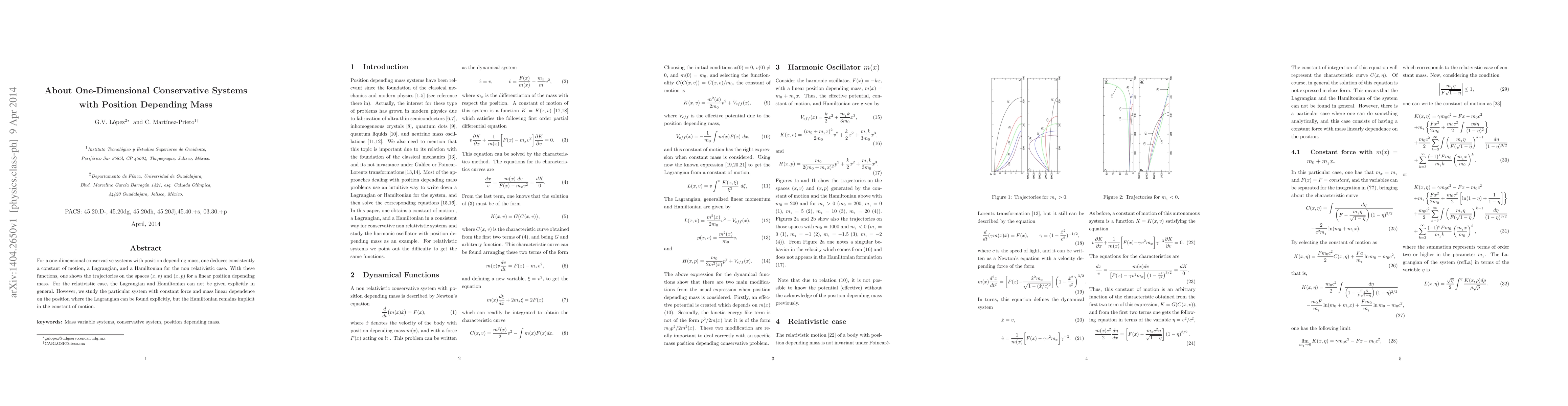 For a one-dimensional conservative systems with position depending mass, one deduces consistently a constant of motion, a Lagrangian, and a Hamiltonian for the non relativistic case. With these functions, one shows the trajectories on the spaces $(x,v)$ and ($x,p)$ for a linear position depending mass. For the relativistic case, the Lagrangian and Hamiltonian can not be given explicitly in general. However, we study the particular system with constant force and mass linear dependence on the position where the Lagrangian can be found explicitly, but the Hamiltonian remains implicit in the constant of motion.