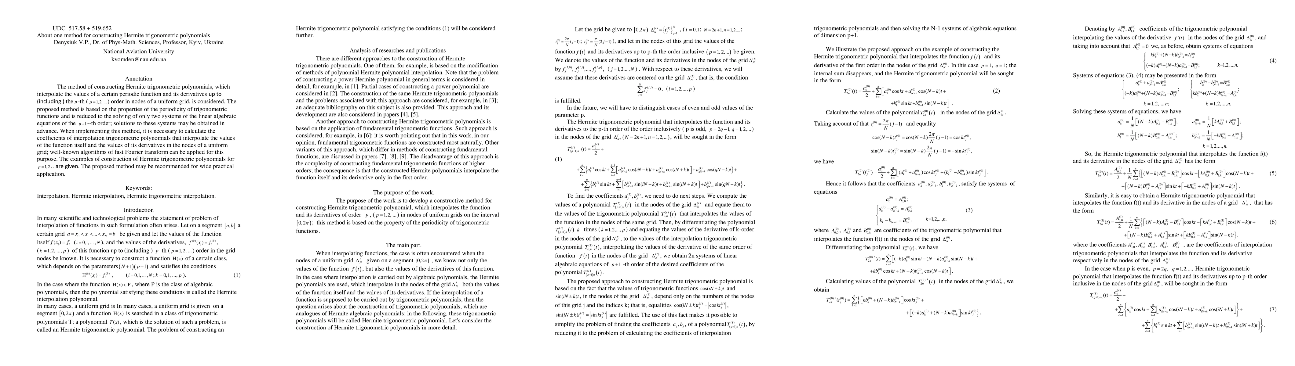 This paper presents a method for constructing Hermite trigonometric polynomials that interpolate both function values and derivatives at uniform grid nodes, relying on periodicity properties and requiring the solution of two linear algebraic equations. Fast Fourier transform algorithms are suggested for efficient coefficient calculation.