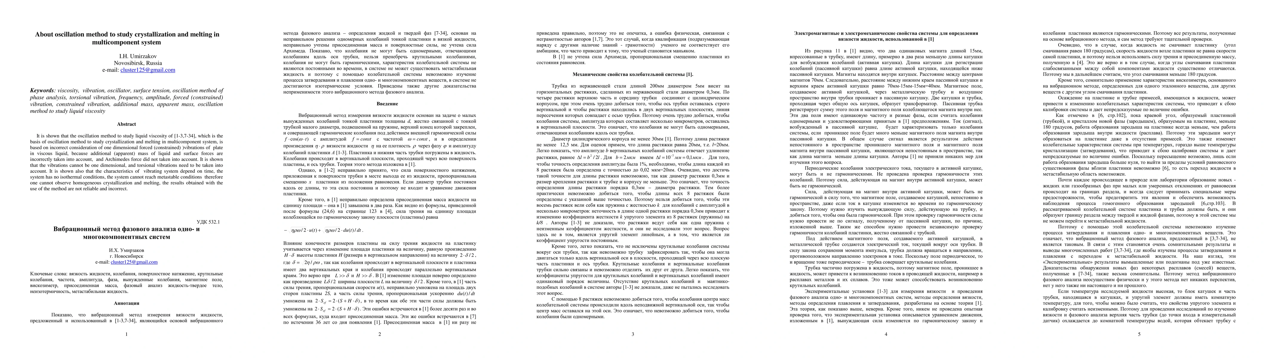 It is shown that the oscillation method to study liquid viscosity of [1-3,7-34], which is the basis of oscillation method to study crystallization and melting in multicomponent system, is based on incorrect consideration of one dimensional forced (constrained) )vibrations of plate in viscous liquid, because additional (apparent) mass of liquid and surface forces are incorrectly taken into account, and Archimedes force did not taken into account. It is shown that the vibrations cannot be one dimensional, and torsional vibrations need to be taken into account. It is shown also that the characteristics of vibrating system depend on time, the system has no isothermal conditions, the system cannot reach metastable conditions therefore one cannot observe homogeneous crystallization and melting, the results obtained with the use of the method are not reliable and incorrect.