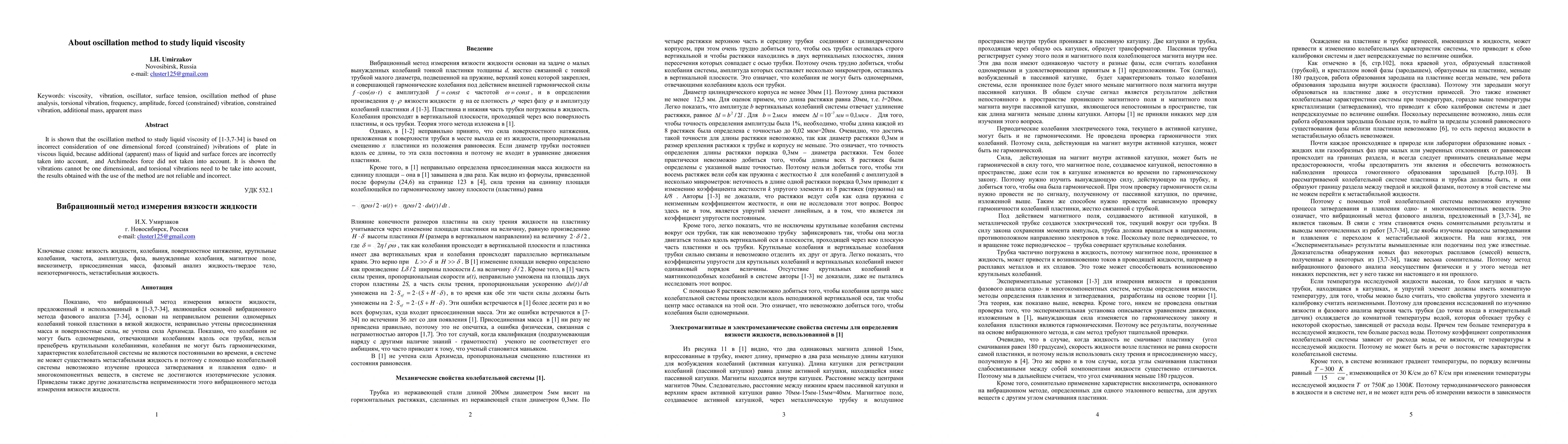 It is shown that the oscillation method to study liquid viscosity of [1-3,7-34] is based on incorrect consideration of one dimensional forced (constrained) )vibrations of plate in viscous liquid, because additional (apparent) mass of liquid and surface forces are incorrectly taken into account, and Archimedes force did not taken into account. It is shown the vibrations cannot be one dimensional, and torsional vibrations need to be take into account, the results obtained with the use of the method are not reliable and incorrect.