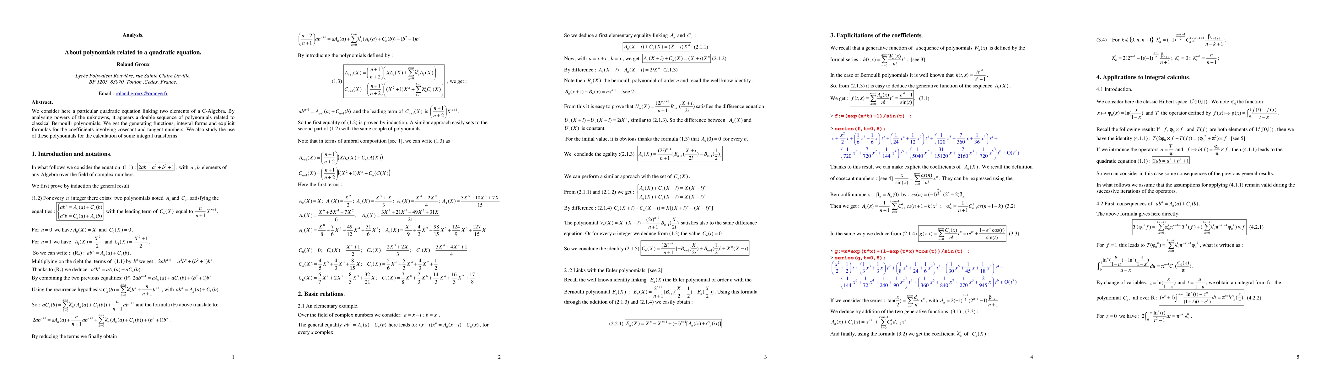 We consider here a particular quadratic equation linking two elements of a C-Algebra. By analysing powers of the unknowns, it appears a double sequence of polynomials related to classical Bernoulli polynomials. We get the generating functions, integral forms and explicit formulas for the coefficients involving cosecant and tangent numbers. We also study the use of these polynomials for the calculation of some integral transforms.