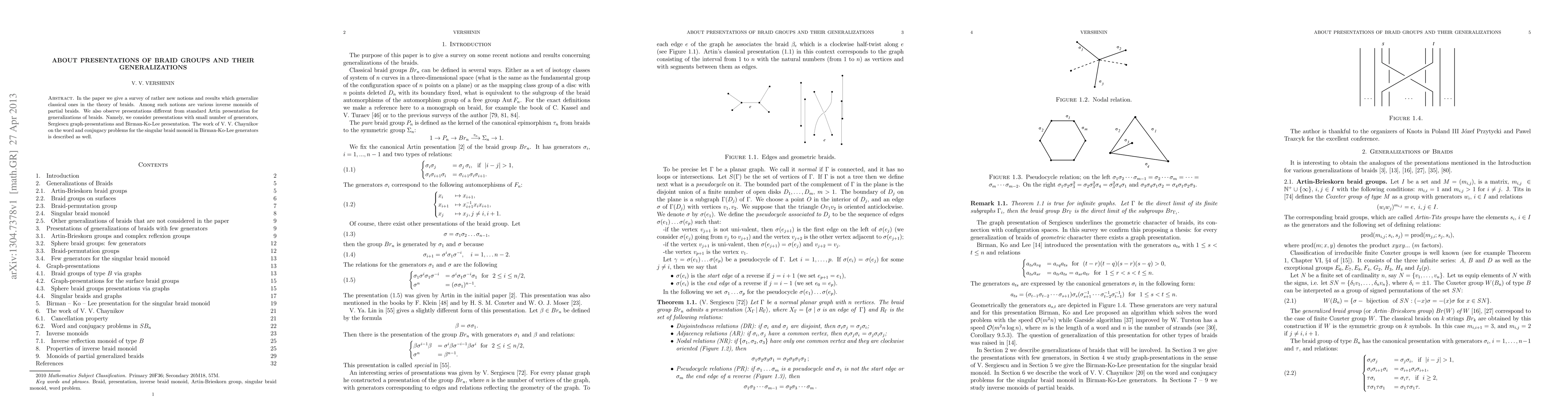 In the paper we give a survey of rather new notions and results which generalize classical ones in the theory of braids. Among such notions are various inverse monoids of partial braids. We also observe presentations different from standard Artin presentation for generalizations of braids. Namely, we consider presentations with small number of generators, Sergiescu graph-presentations and Birman-Ko-Lee presentation. The work of V.V.Chaynikov on the word and conjugacy problems for the singular braid monoid in Birman-Ko-Lee generators is described as well.