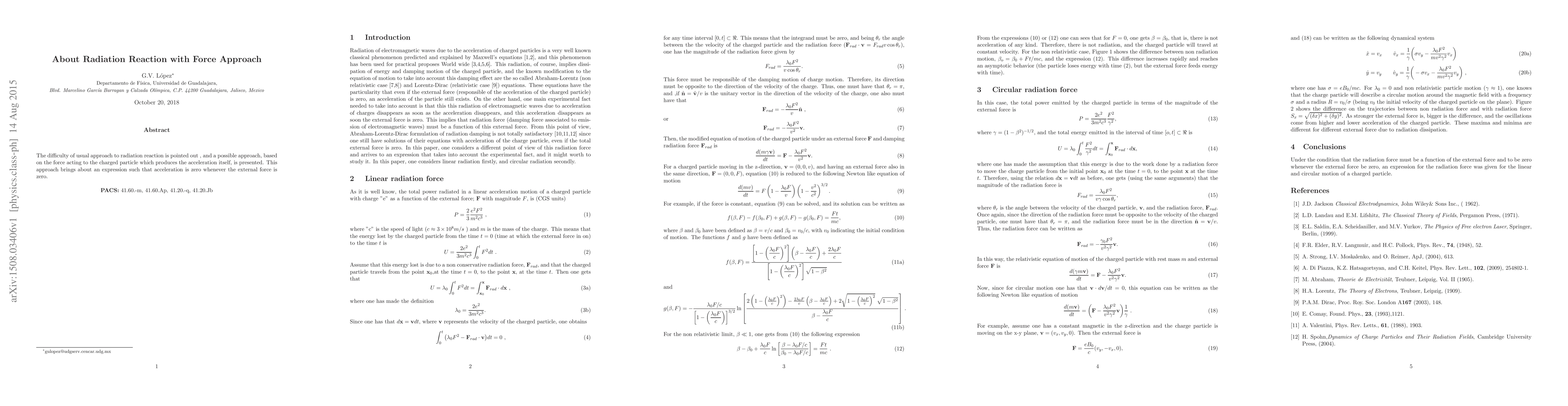 This paper critiques the conventional method for addressing radiation reaction and proposes an alternative approach based on the force causing the particle's self-acceleration, resulting in an expression where acceleration is zero when the external force is absent.