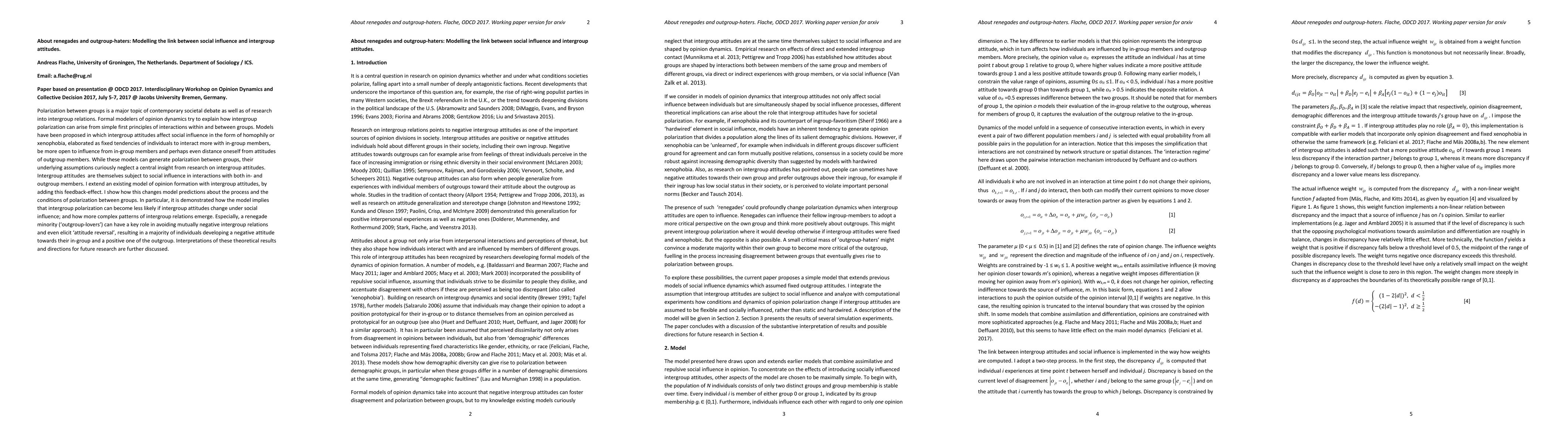 Polarization between groups is a major topic of contemporary societal debate as well as of research into intergroup relations. Formal modelers of opinion dynamics try to explain how intergroup polarization can arise from simple first principles of interactions within and between groups. Models have been proposed in which intergroup attitudes affect social influence in the form of homophily or xenophobia, elaborated as fixed tendencies of individuals to interact more with in-group members, be more open to influence from in-group members and perhaps even distance oneself from attitudes of outgroup members. While these models can generate polarization between groups, their underlying assumptions curiously neglect a central insight from research on intergroup attitudes. Intergroup attitudes are themselves subject to social influence in interactions with both in- and outgroup members. I extend an existing model of opinion formation with intergroup attitudes, by adding this feedback-effect. I show how this changes model predictions about the process and the conditions of polarization between groups. In particular, it is demonstrated how the model implies that intergroup polarization can become less likely if intergroup attitudes change under social influence; and how more complex patterns of intergroup relations emerge. Especially, a renegade minority (outgroup-lovers) can have a key role in avoiding mutually negative intergroup relations and even elicit attitude reversal, resulting in a majority of individuals developing a negative attitude towards their in-group and a positive one of the outgroup. Interpretations of these theoretical results and directions for future research are further discussed.