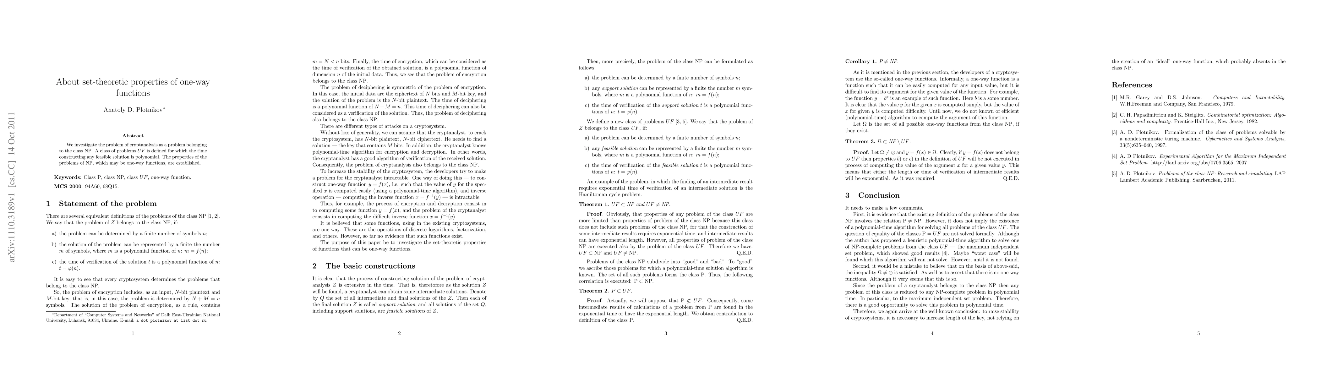 Researchers investigate set-theoretic properties of one-way functions to understand how problems in NP can be solved efficiently. They establish the properties of these problems, which may have implications for cryptography and security.