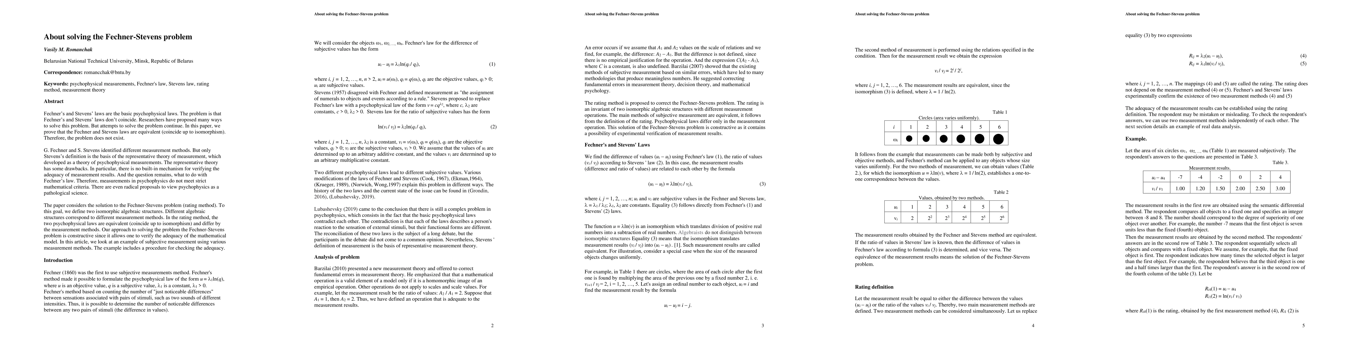 In this paper, we prove that the Fechner and Stevens laws are equivalent (coincide up to isomorphism). Therefore, the problem does not exist.