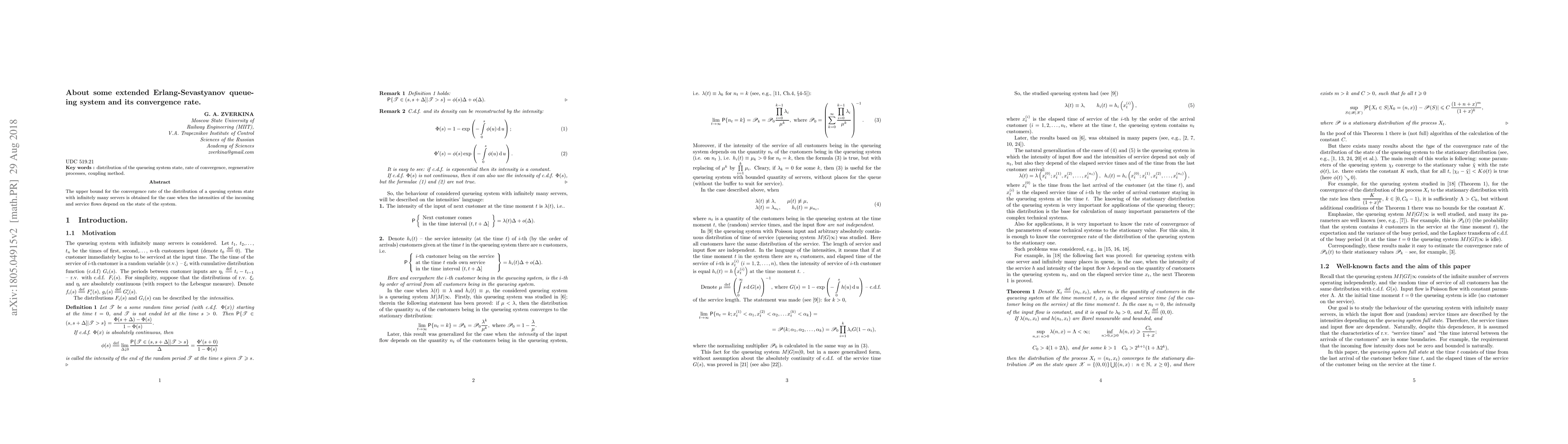 The upper bound for the convergence rate of the distribution of the state of a queuing system with infinitely many servers is obtained, in the case when the intensity of the incoming flow and the intensity of the service depend on the state of the system. Typos and spelling errors have been corrected in the new version of the text; the content of the text has remained unchanged. ----- Poluchena ocenka sverhu dlia skorosti shodimosti raspredeleniia sostoianiia beskonechnolinejnoj sistemy massovogo obsluzhivaniia v sluchae, kogda intensivnost` vhodiashchego potoka i intensivnost` obsluzhivaniia zavisiat ot sostoianiia sistemy. Opechatki i orfograficheskie oshibki ispravleny v novoj versii teksta; soderzhanie teksta ostalos' neizmennym.
