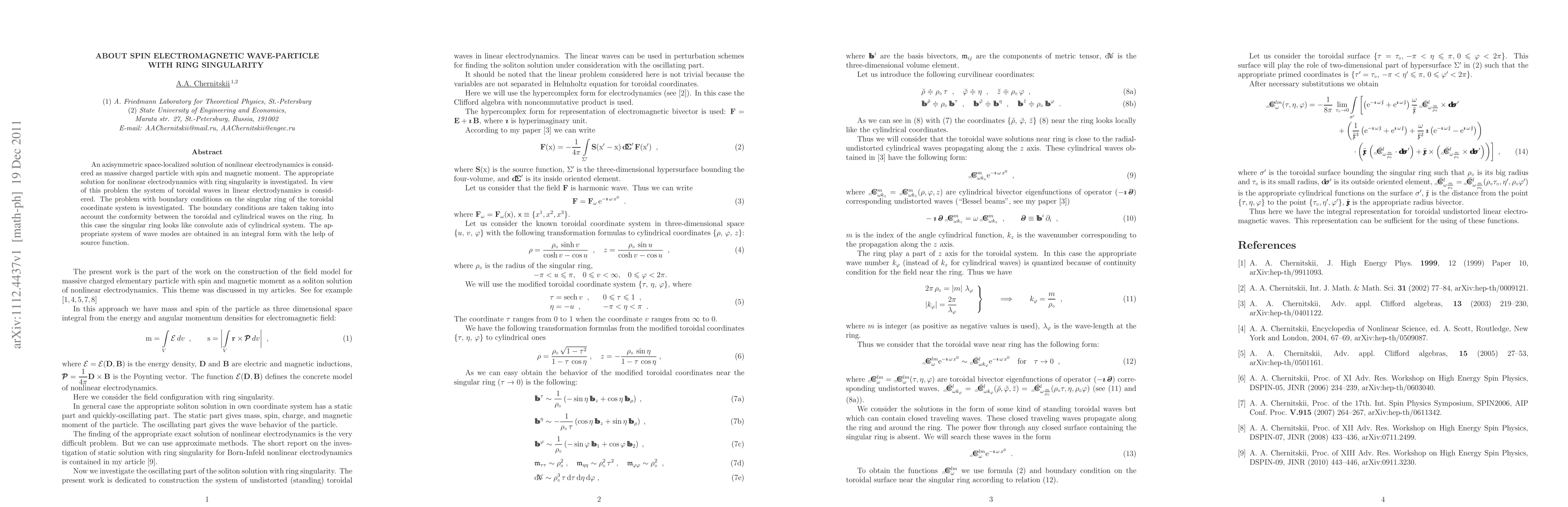 This paper explores a massive charged particle with spin and magnetic moment, modeled as a solution of nonlinear electrodynamics with a ring singularity. It investigates toroidal wave systems in linear electrodynamics, considering boundary conditions on the singular ring. The study yields integral form wave mode systems via a source function, revealing the singular ring as a convolute axis of a cylindrical system.