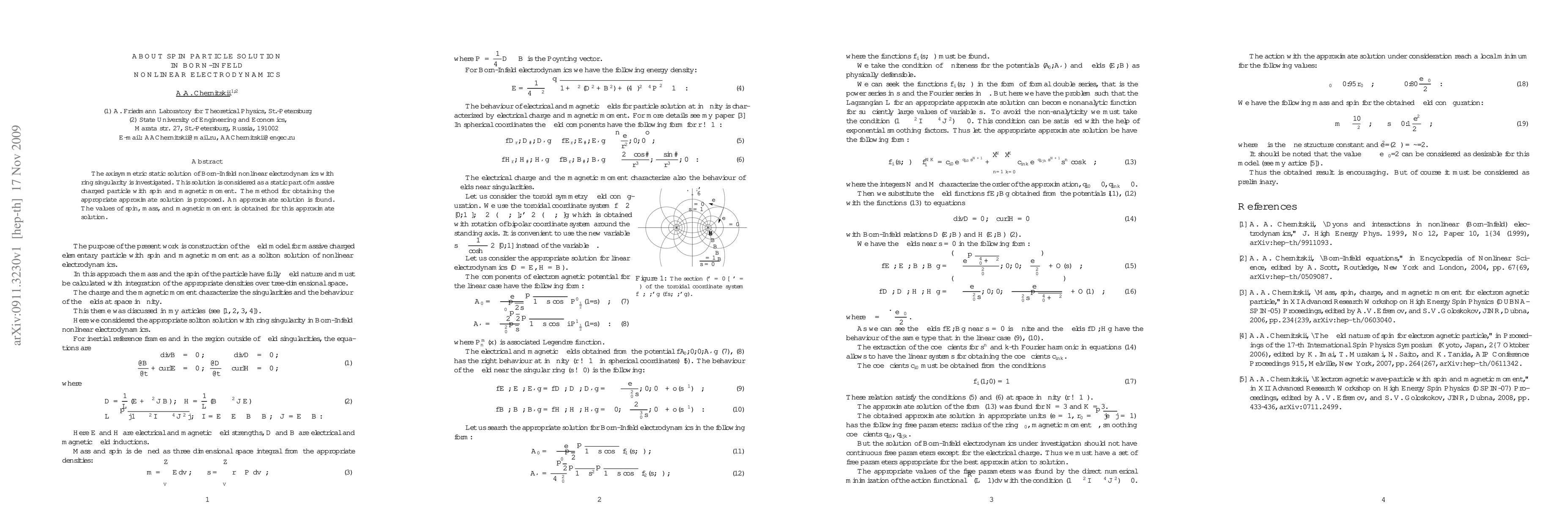 The axisymmetric static solution of Born-Infeld nonlinear electrodynamics with ring singularity is investigated. This solution is considered as a static part of massive charged particle with spin and magnetic moment. The method for obtaining the appropriate approximate solution is proposed. An approximate solution is found. The values of spin, mass, and magnetic moment is obtained for this approximate solution.