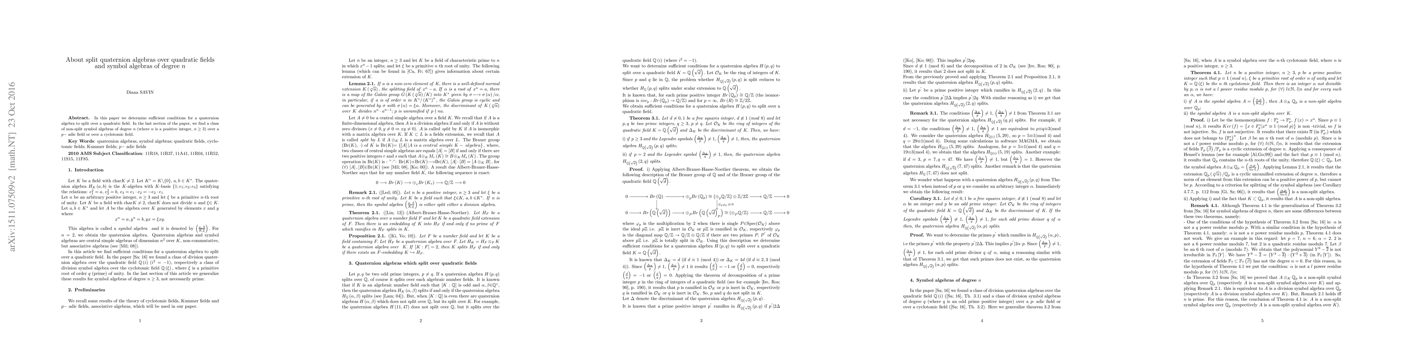 In this paper we determine sufficient conditions for a quaternion algebra to split over a quadratic field. In the last section of the paper, we find a class of division symbol algebras of degree $n$ (where $n$ is a positive integer, $n\geq 3$) over a $p-$ adic field or over a cyclotomic field.