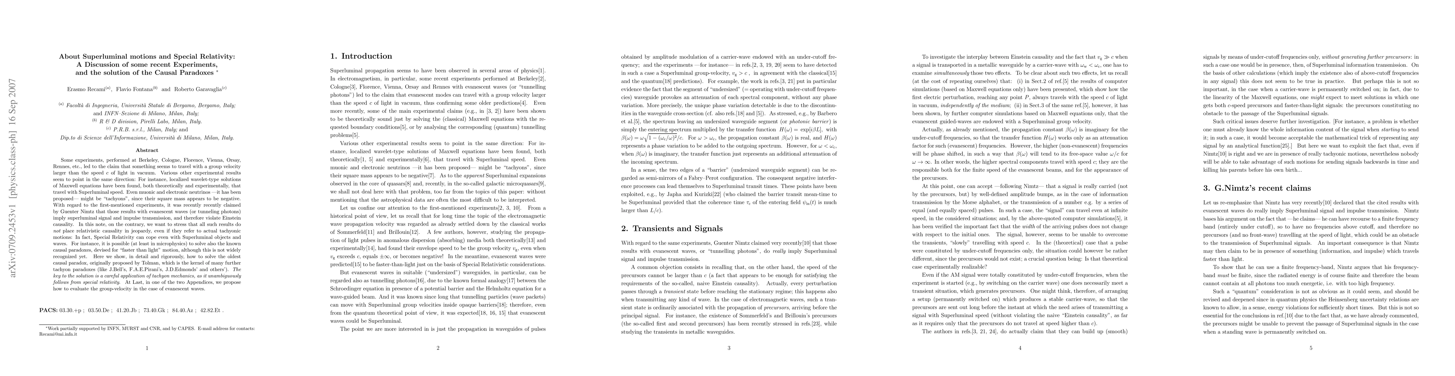 Some experiments, performed at Berkeley, Cologne, Florence, Vienna, Orsay, Rennes, etc., led to the claim that something seems to travel with a group velocity larger than the speed c of light in vacuum. Various other experimental results seem to point in the same direction: For instance, localized wavelet- type solutions to Maxwell equations have been found, both theoretically and experimentally, that travel with superluminal speed. [Even muonic and electronic neutrinos [it has been proposed] might be "tachyons", since their square mass appears to be negative]. With regard to the first-mentioned experiments, it was recently claimed by Guenter Nimtz that those results with evanescent waves (or tunneling photons) imply superluminal signal and impulse transmission, and therefore violate Einstein causality. In this note we want to stress that, on the contrary, all such results do not place relativistic causality in jeopardy, even if they referred to actual tachyonic motions: In fact, Special Relativity can cope even with superluminal objects and waves. For instance, it is possible (at least in microphysics) to solve also the known causal paradoxes, devised for faster than light motion, although this is not widely recognized yet. Here we show, in detail and rigorously, how to solve the oldest causal paradox, originally proposed by Tolman, which is the kernel of many further tachyon paradoxes (like J.Bell's, F.A.E.Pirani's, J.D.Edmonds' and others'). The key to the solution is a careful application of tachyon mechanics, as it unambiguously follows from special relativity. At Last, in one of the two Appendices, we propose how to evaluate the group-velocity in the case of evanescent waves. [PACS nos.: 03.30.+p; 03.50.De; 41.20.Jb; 73.40.Gk; 84.40.Az; 42.82.Et ]