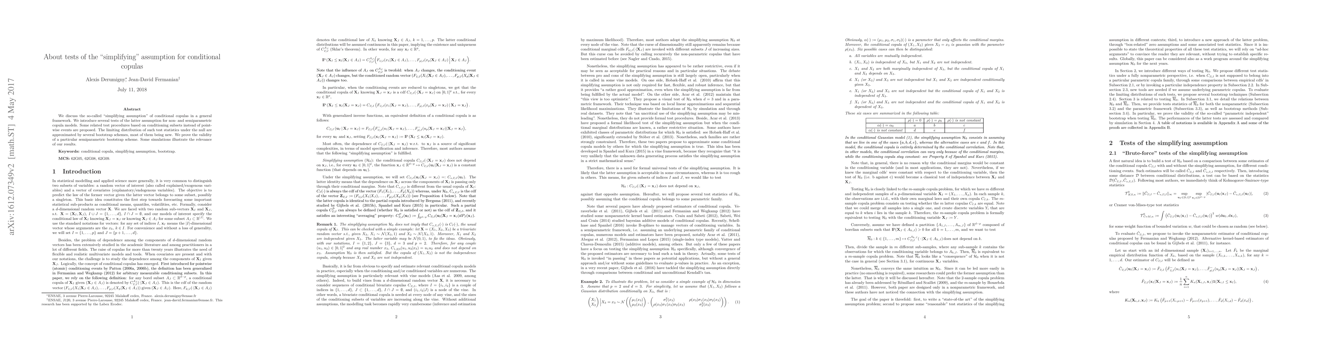 This paper introduces tests for the "simplifying assumption" in conditional copulas within a general framework, proposing new non- and semiparametric copula models. It also develops bootstrap schemes to approximate the limiting distribution of test statistics, proving the validity of a specific semiparametric bootstrap method, and demonstrates the relevance through simulations.