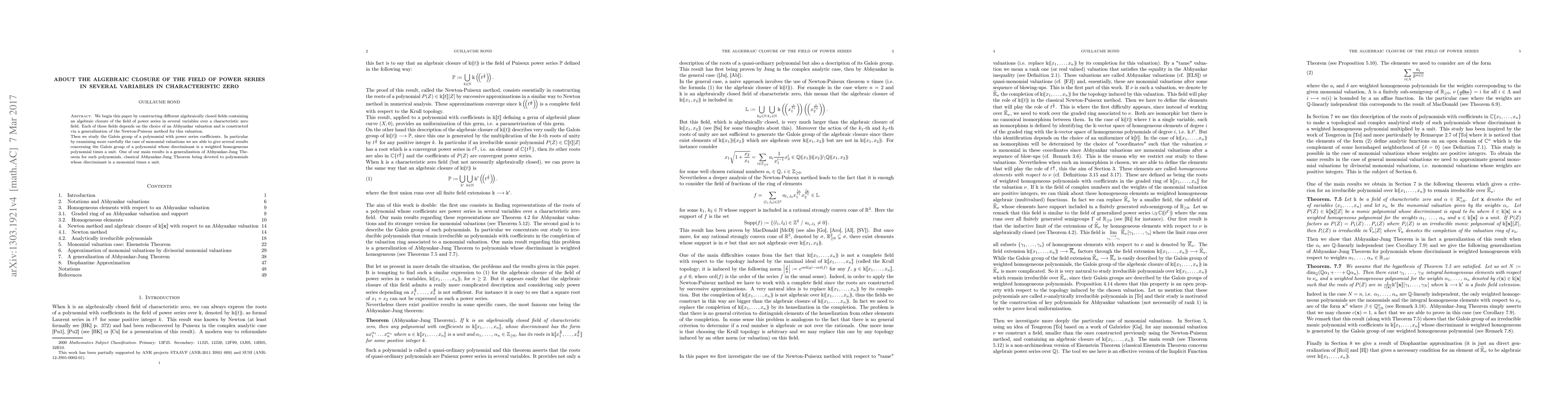 Summary: This paper constructs algebraically closed fields containing the algebraic closure of power series fields in several variables over characteristic zero, using Abhyankar valuations and the Newton-Puiseux method. It also generalizes the Abhyankar-Jung Theorem for monic polynomials with weighted homogeneous discriminants.