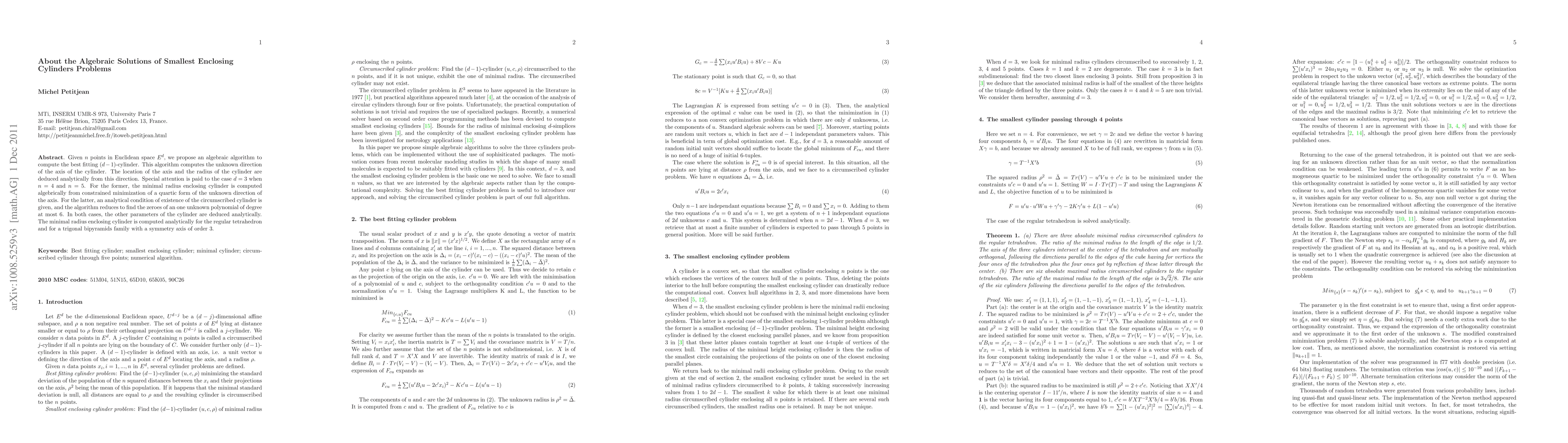 Researchers propose an algebraic algorithm to find the smallest enclosing cylinder for a set of points in Euclidean space, with special focus on cases for 3D space and specific polyhedra.