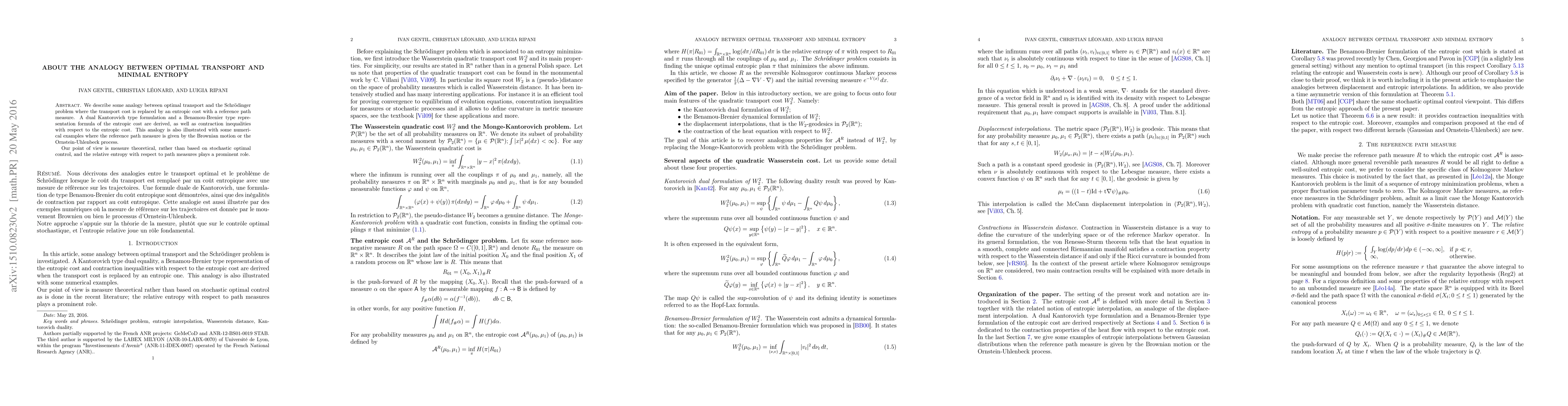 We describe some analogy between optimal transport and the Schr\"odinger problem where the transport cost is replaced by an entropic cost with a reference path measure. A dual Kantorovich type formulation and a Benamou-Brenier type representation formula of the entropic cost are derived, as well as contraction inequalities with respect to the entropic cost. This analogy is also illustrated with some numerical examples where the reference path measure is given by the Brownian or the Ornstein-Uhlenbeck process. Our point of view is measure theoretical and the relative entropy with respect to path measures plays a prominent role.