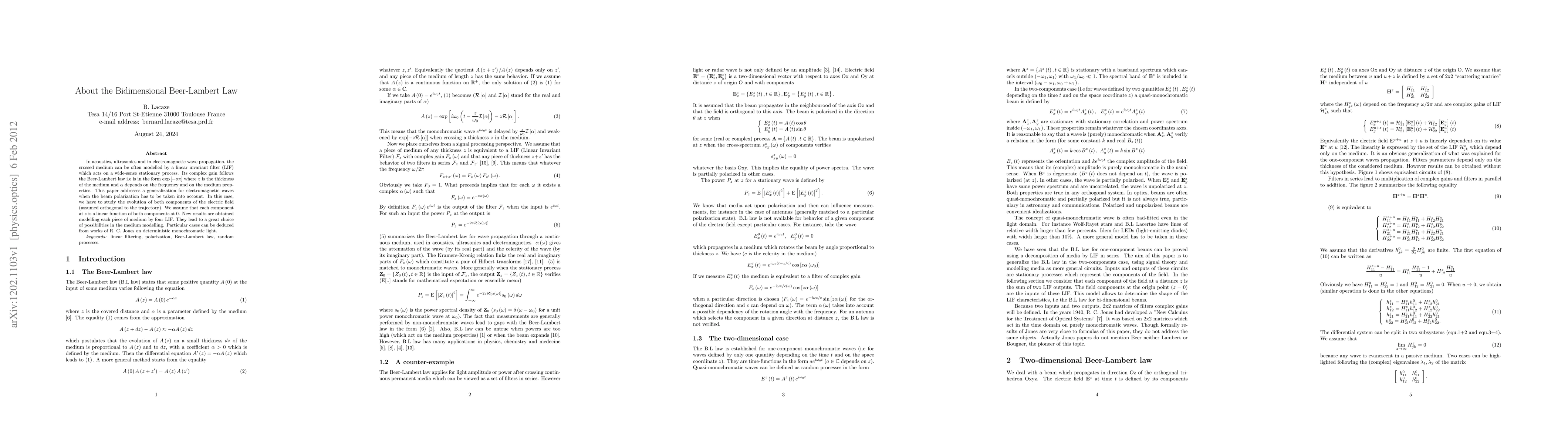 In acoustics, ultrasonics and in electromagnetic wave propagation, the crossed medium can be often modelled by a linear invariant filter (LIF) which acts on a wide-sense stationary process. Its complex gain follows the Beer-Lambert law i.e is in the form exp [-\alphaz] where z is the thickness of the medium and \alpha depends on the frequency and on the medium properties. This paper addresses a generalization for electromagnetic waves when the beam polarization has to be taken into account. In this case, we have to study the evolution of both components of the electric field (assumed orthogonal to the trajectory). We assume that each component at z is a linear function of both components at 0. New results are obtained modelling each piece of medium by four LIF. They lead to a great choice of possibilities in the medium modelling. Particular cases can be deduced from works of R. C. Jones on deterministic monochromatic light. keywords: linear filtering, polarization, Beer-Lambert law, random processes.