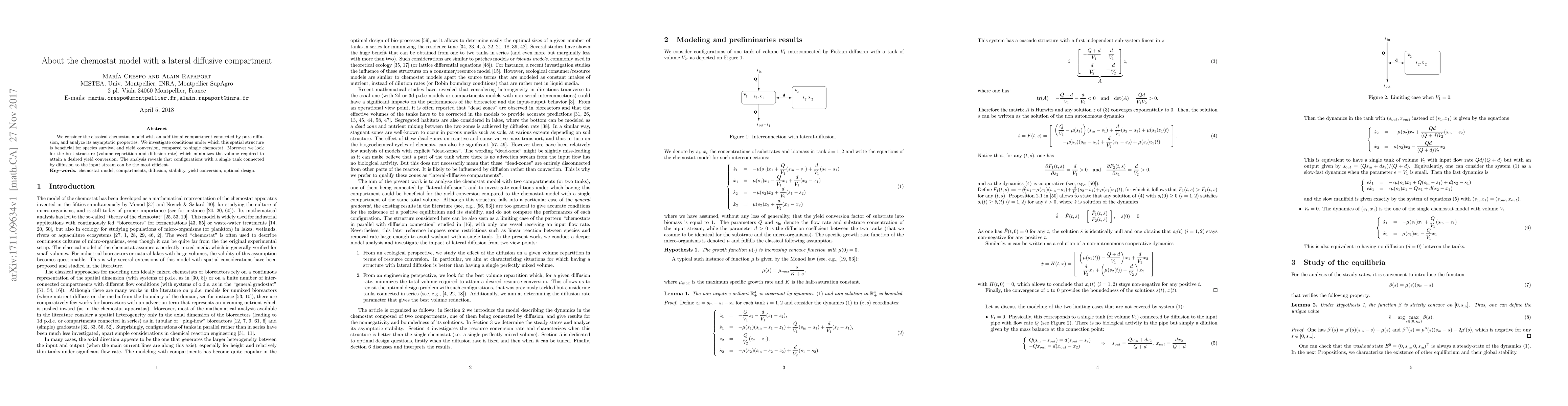This paper examines the chemostat model augmented with a lateral diffusive compartment, analyzing its long-term benefits for species survival and yield conversion. It finds that configurations with a single tank linked by diffusion to the input stream can be most efficient in minimizing volume for desired yield conversion.