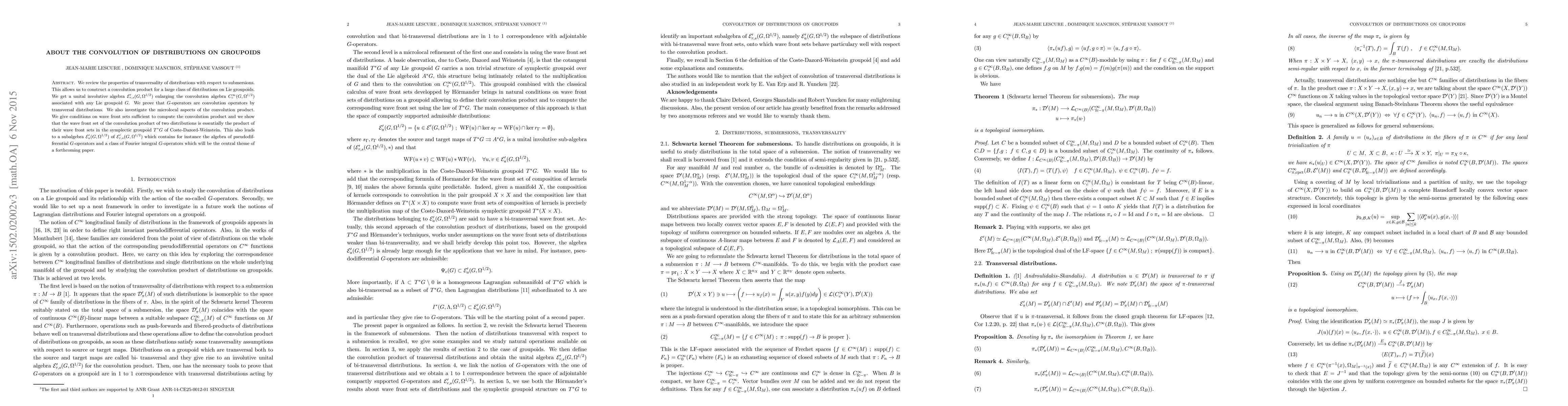 We review the properties of transversality of distributions with respect to submersions. This allows us to construct a convolution product for a large class of distributions on Lie groupoids. We get a unital involutive algebra $\cE\_{r,s}'(G,\Omega^{1/2})$ enlarging the convolution algebra $C^\infty\_c(G,\Omega^{1/2})$ associated with any Lie groupoid $G$. We prove that $G$-operators are convolution operators by transversal distributions. We also investigate the microlocal aspects of the convolution product. We give conditions on wave front sets sufficient to compute the convolution product and we show that the wave front set of the convolution product of two distributions is essentially the product of their wave front sets in the symplectic groupoid $T^*G$ of Coste-Dazord-Weinstein. This also leads to a subalgebra $\cE\_{a}'(G,\Omega^{1/2})$ of $\cE\_{r,s}'(G,\Omega^{1/2})$ which contains for instance the algebra of pseudodifferential $G$-operators and a class of Fourier integral $G$-operators which will be the central theme of a forthcoming paper.