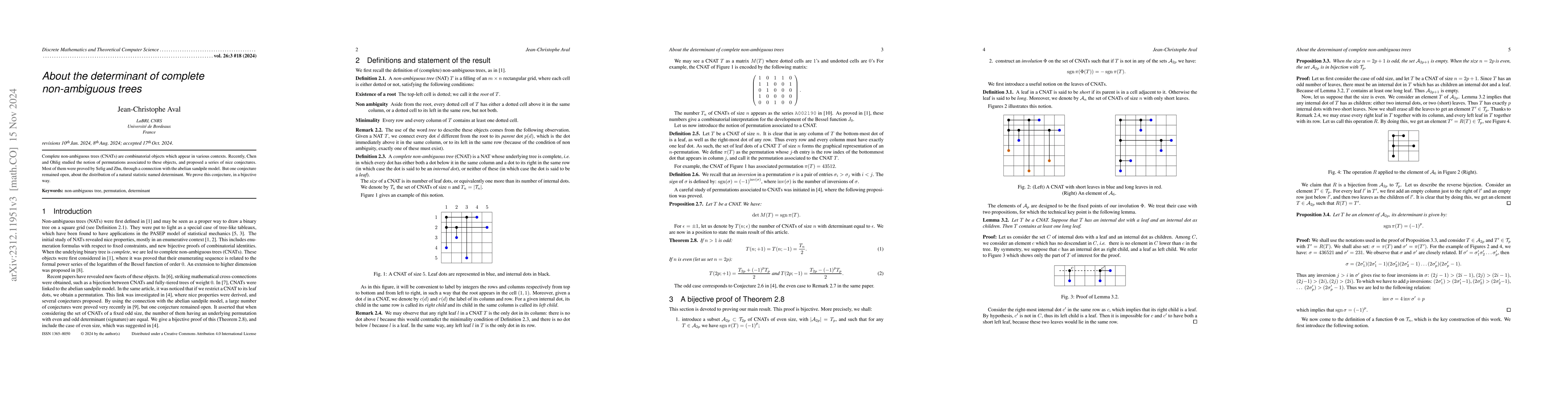 Complete non-ambiguous trees (CNATs) are combinatorial objects which appear in various contexts. Recently, Chen and Ohlig studied the notion of leaf permutation on these objects, and proposed a series of nice conjectures. Most of them were proved by Selig and Zhu, through a connexion with the abelian sandpile model. But one conjecture remained open, about the distribution of a natural statistic named determinant. We prove this conjecture, in a bijective way.