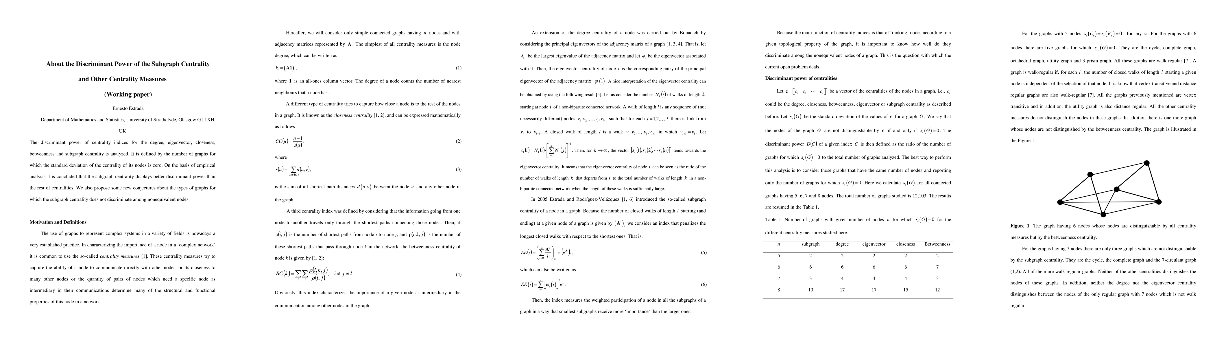This paper analyzes the discriminant power of various centrality measures, including degree, eigenvector, closeness, betweenness, and subgraph centrality. Empirical results show that subgraph centrality exhibits superior discriminant power compared to other measures, and the paper proposes new conjectures about graph types where subgraph centrality fails to distinguish nonequivalent nodes.