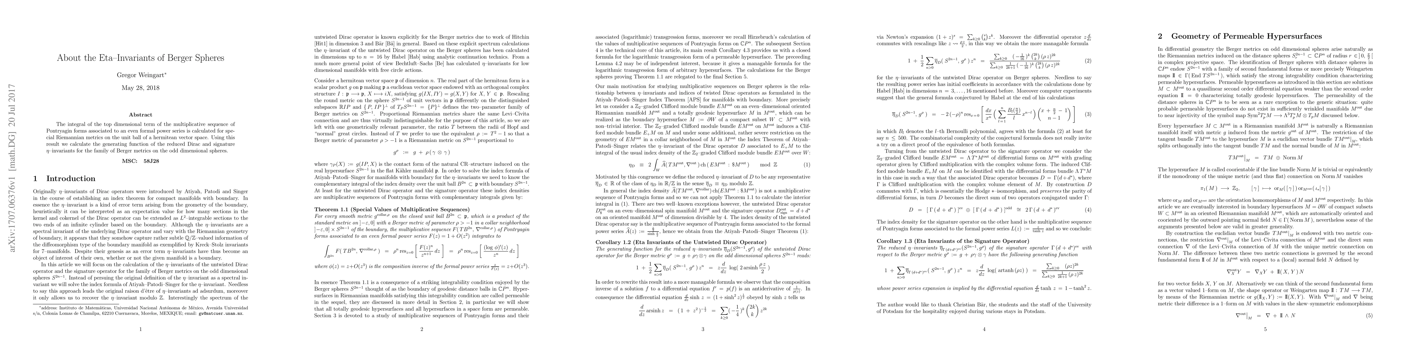 The paper calculates eta-invariants for Berger spheres using a multiplicative sequence of Pontryagin forms associated with special Riemannian metrics on the unit ball of a hermitean vector space.