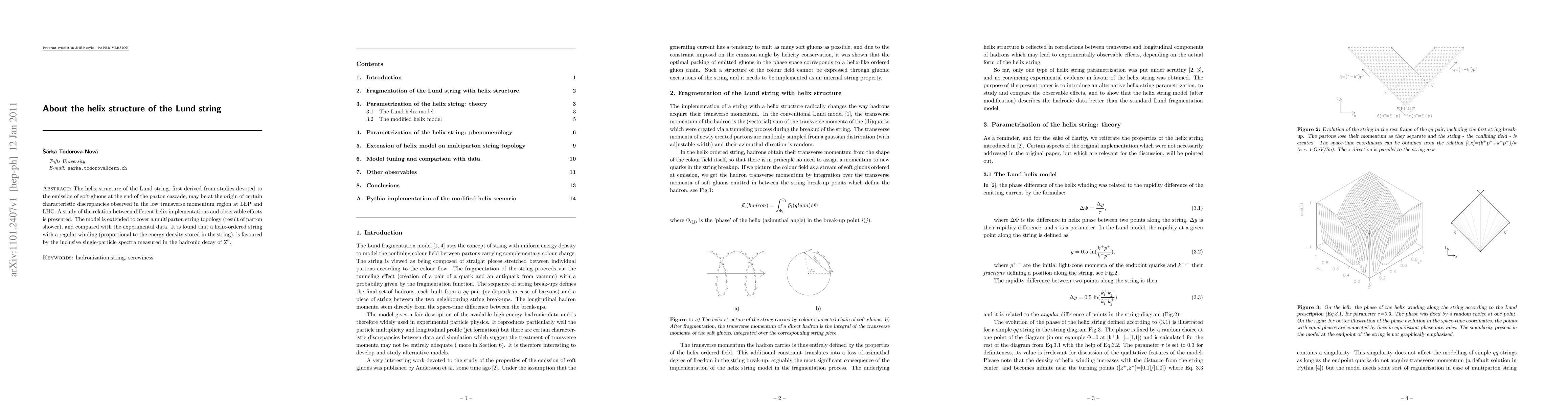 The helix structure of the Lund string, first derived from studies devoted to the emission of soft gluons at the end of the parton cascade, may be at the origin of certain characteristic discrepancies observed in the low transverse momentum region at LEP and LHC. A study of the relation between different helix implementations and observable effects is presented. The model is extended to cover a multiparton string topology (result of parton shower), and compared with the experimental data. It is found that a helix-ordered string with a regular winding (proportional to the energy density stored in the string), is favoured by the inclusive single-particle spectra measured in the hadronic decay of Z$^0$.