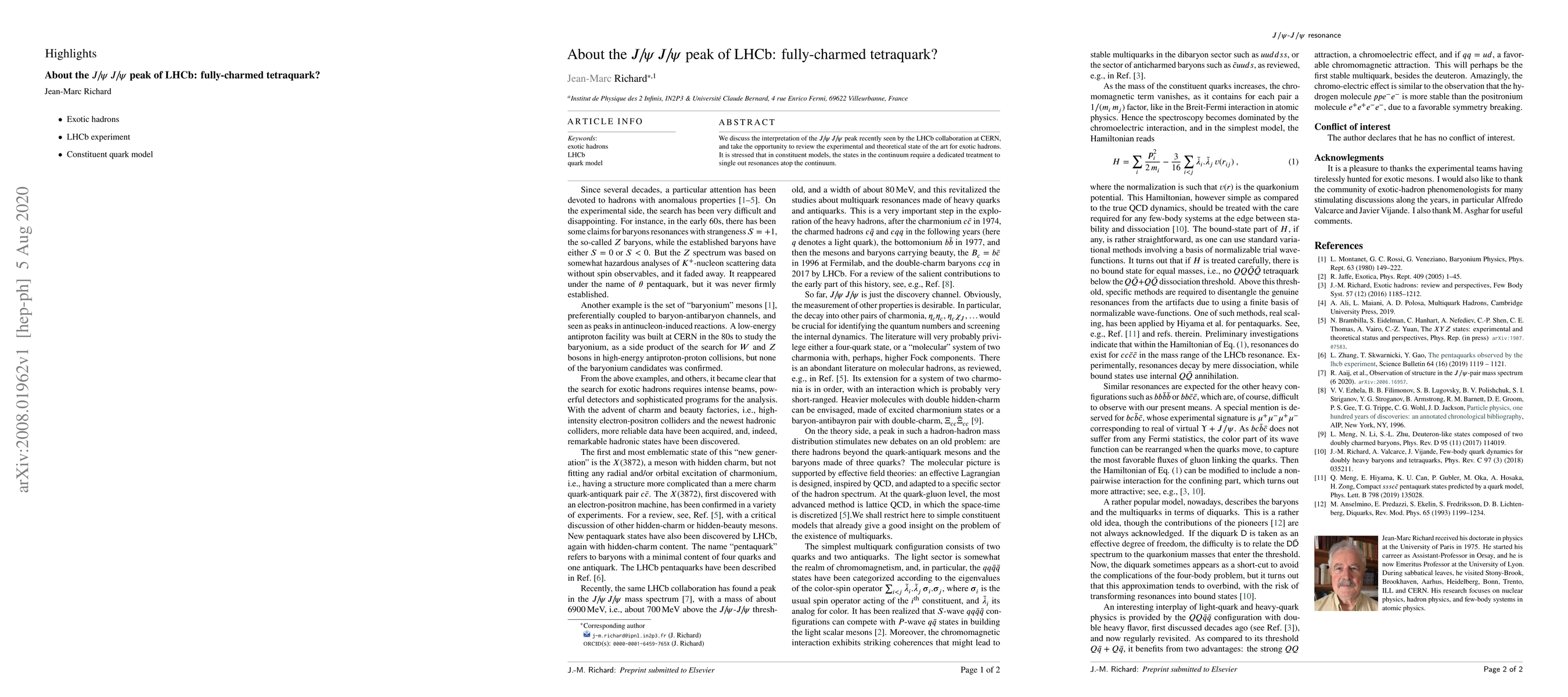 We discuss the interpretation of the $J\!/\!\psi\,J\!/\!\psi$ peak recently seen by the LHCb collaboration at CERN, and take the opportunity to review the experimental and theoretical state of the art for exotic hadrons. It is stressed that in constituent models, the states in the continuum require a dedicated treatment to single out resonances atop the continuum.