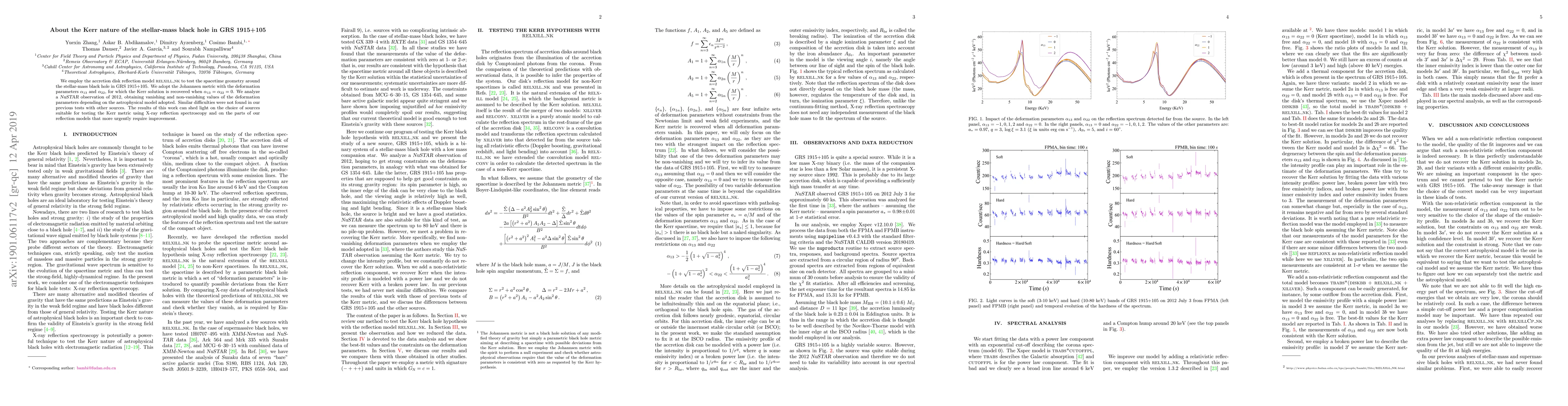 We employ the accretion disk reflection model RELXILL_NK to test the spacetime geometry around the stellar-mass black hole in GRS 1915+105. We adopt the Johannsen metric with the deformation parameters $\alpha_{13}$ and $\alpha_{22}$, for which the Kerr solution is recovered when $\alpha_{13} = \alpha_{22} = 0$. We analyze a NuSTAR observation of 2012, obtaining vanishing and non-vanishing values of the deformation parameters depending on the astrophysical model adopted. Similar difficulties were not found in our previous tests with other sources. The results of this work can shed light on the choice of sources suitable for testing the Kerr metric using X-ray reflection spectroscopy and on the parts of our reflection models that more urgently require improvement.