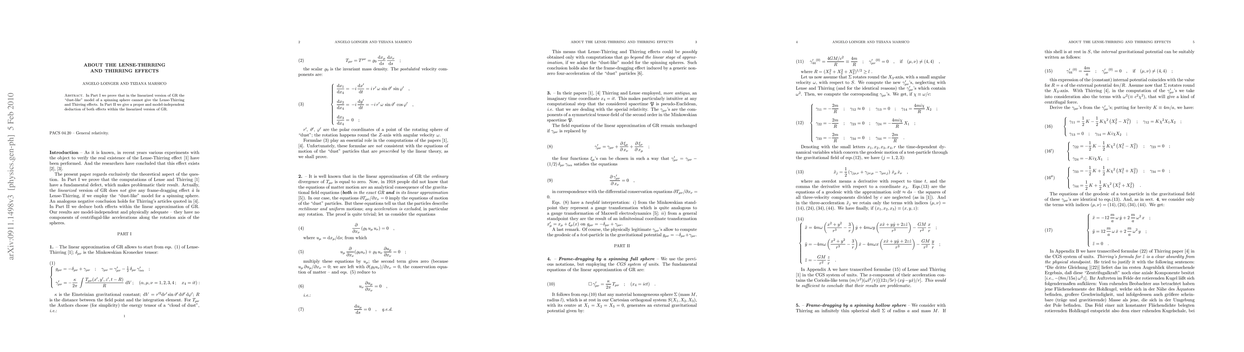 In Part I we prove that in the linearized version of GR the dust-like model of a spinning sphere cannot give the Lense-Thirring and Thirring effects. In Part II we give a proper and model-independent deduction of both effects within the linearized version of GR.