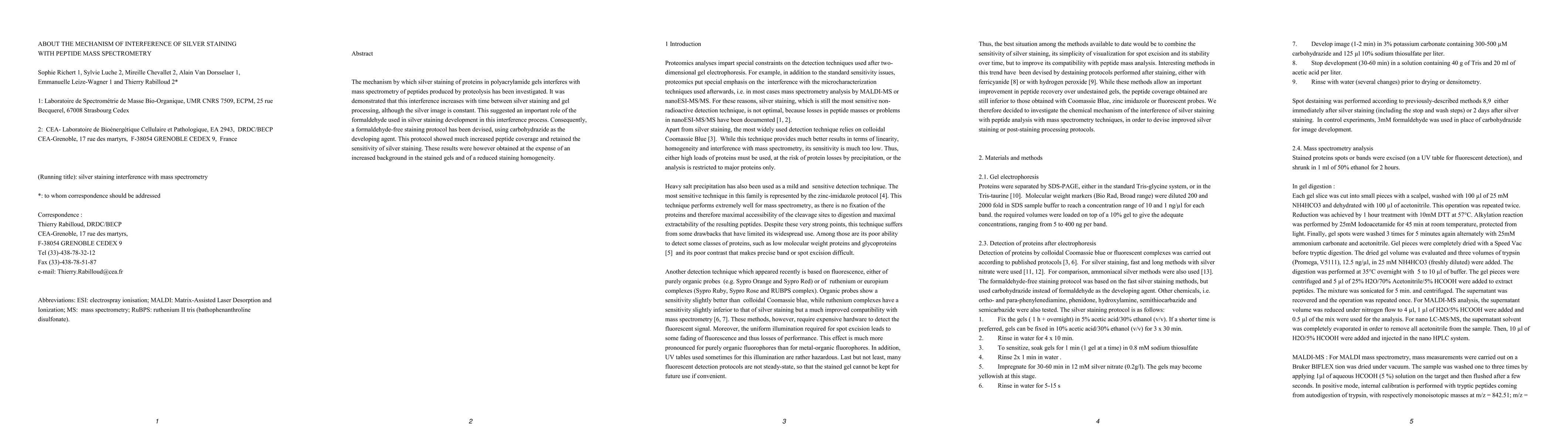 This study investigates how silver staining interferes with peptide mass spectrometry, finding that formaldehyde in the staining process exacerbates the issue over time. A formaldehyde-free protocol using carbohydrazide was developed, which improved peptide coverage but increased background and reduced staining uniformity.