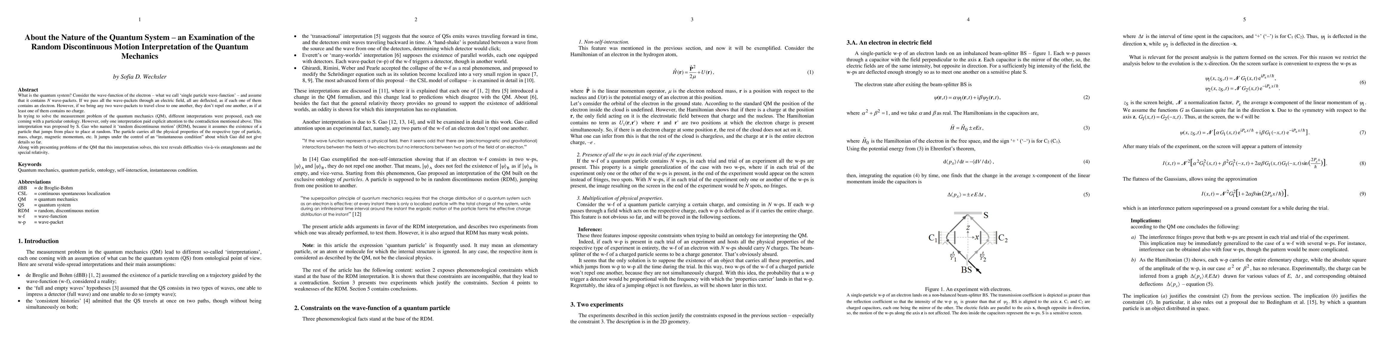 What is the quantum system? Consider the wavefunction of the electron, what we call single particle wave-function and assume that it contains N wave packets. If we pass all the wave packets through an electric field, all are deflected, as if each one of them contains an electron. However, if we bring any two wave packets to travel close to one another, they do not repel one another, as if at least one of them contains no charge. In trying to solve the measurement problem of the quantum mechanics (QM), different interpretations were proposed, each one coming with a particular ontology. However, only one interpretation paid explicit attention to the contradiction mentioned above. This interpretation was proposed by S. Gao who named it random discontinuous motion (RDM), because it assumes the existence of a particle that jumps from place to place at random. The particle carries all the physical properties of the respective type of particle, mass, charge, magnetic momentum, etc. It jumps under the control of a so called instantaneous condition about which Gao did not give details so far. Along with presenting problems of the QM that this interpretation solves, this text reveals difficulties vis-\`a-vis entanglements and the special relativity.