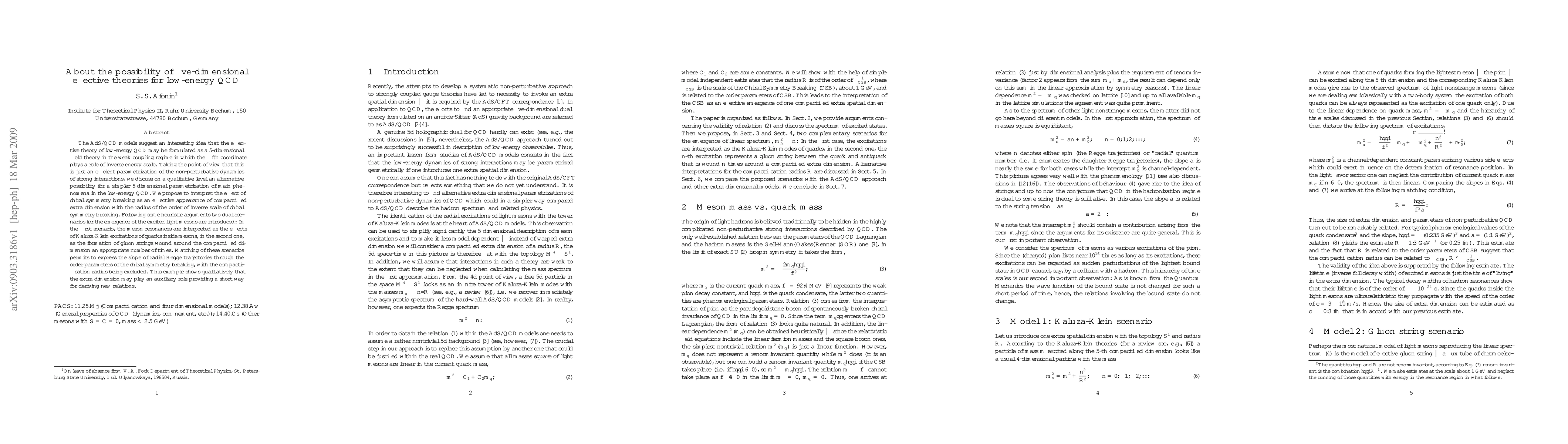 The AdS/QCD models suggest an interesting idea that the effective theory of low-energy QCD may be formulated as a 5-dimensional field theory in the weak coupling regime in which the fifth coordinate plays a role of inverse energy scale. Taking the point of view that this is just an efficient parametrization of the non-perturbative dynamics of strong interactions, we discuss on a qualitative level an alternative possibility for a simpler 5-dimensional parametrization of main phenomena in the low-energy QCD. We propose to interpret the effect of chiral symmetry breaking as an effective appearance of compactified extra dimension with the radius of the order of inverse scale of chiral symmetry breaking. Following some heuristic arguments two dual scenarios for the emergence of the excited light mesons are introduced: In the first scenario, the meson resonances are interpreted as the effects of Kaluza-Klein excitations of quarks inside mesons, in the second one, as the formation of gluon strings wound around the compactified dimension an appropriate number of times. Matching of these scenarios permits to express the slope of radial Regge trajectories through the order parameters of the chiral symmetry breaking, with the compactification radius being excluded. This example shows qualitatively that the extra dimension may play an auxiliary role providing a short way for deriving new relations.