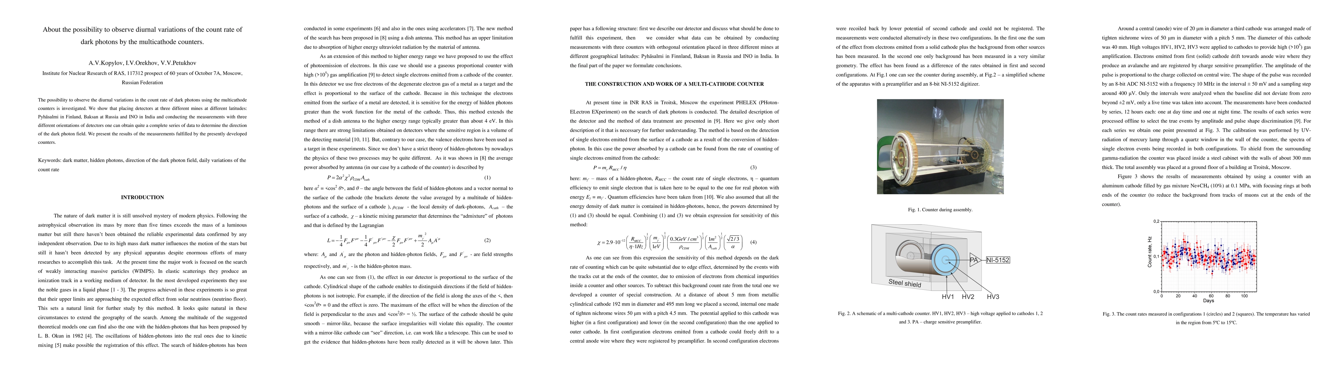The possibility to observe the diurnal variations in the count rate of dark photons using the multicathode counters is investigated. We show that placing detectors at three different mines at different latitudes: Pyh\"asalmi in Finland, Baksan at Russia and INO in India and conducting the measurements with three different orientations of detectors one can obtain quite a complete series of data to determine the direction of the dark photon field. We present the results of the measurements fulfilled by the presently developed counters.