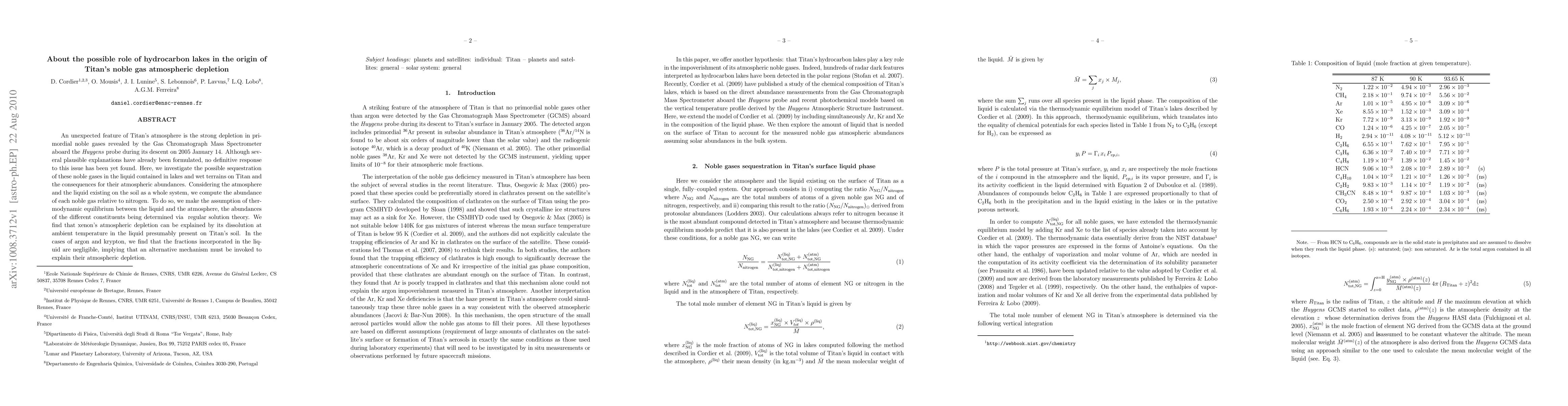 This paper explores the potential role of hydrocarbon lakes on Titan in the depletion of noble gases in its atmosphere, suggesting that xenon's depletion can be explained by its dissolution in these lakes, while argon and krypton's depletion likely requires another mechanism.