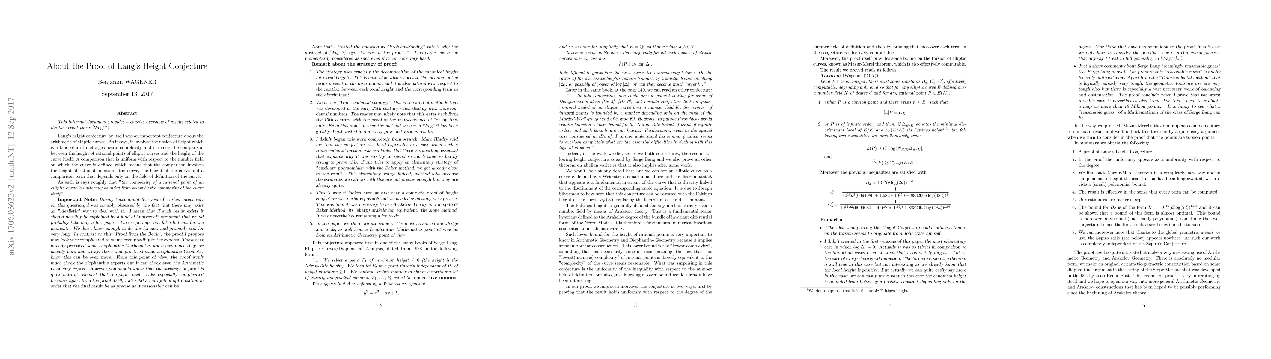 This is an informal paper presenting historical results around the recent paper of the author about Lang's Conjecture and torsion of elliptic curves. This paper also discusses a few aspects of the proof.