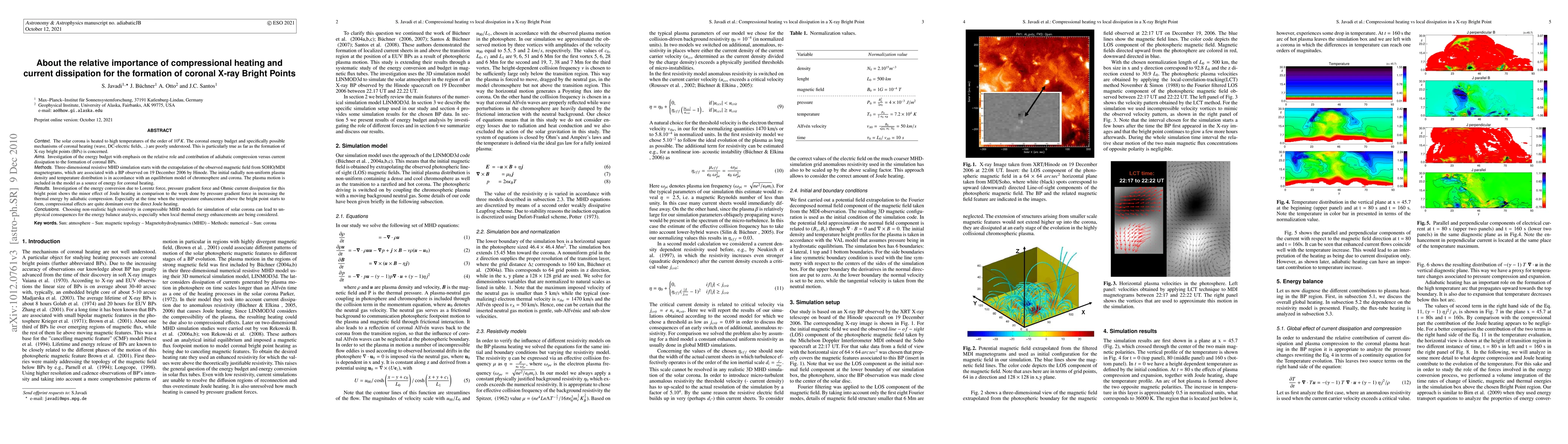 Context. The solar corona is heated to high temperatures of the order of 10^{6} K. The coronal energy budget and specifically possible mechanisms of coronal heating (wave, DC-electric fields, ..) are poorly understood. This is particularly true as far as the formation of X-ray bright points (BPs) is concerned. Aims. Investigation of the energy budget with emphasis on the relative role and contribution of adiabatic compression versus current dissipation to the formation of coronal BPs. Methods. Three-dimensional resistive MHD simulation starts with the extrapolation of the observed magnetic field from SOHO/MDI magnetograms, which are associated with a BP observed on 19 December 2006 by Hinode. The initial radially non-uniform plasma density and temperature distribution is in accordance with an equilibrium model of chromosphere and corona. The plasma motion is included in the model as a source of energy for coronal heating. Results. Investigation of the energy conversion due to Lorentz force, pressure gradient force and Ohmic current dissipation for this bright point shows the minor effect of Joule heating in comparison to the work done by pressure gradient force in increasing the thermal energy by adiabatic compression. Especially at the time when the temperature enhancement above the bright point starts to form, compressional effects are quite dominant over the direct Joule heating. Conclusions. Choosing non-realistic high resistivity in compressible MHD models for simulation of solar corona can lead to unphysical consequences for the energy balance analysis, especially when local thermal energy enhancements are being considered.