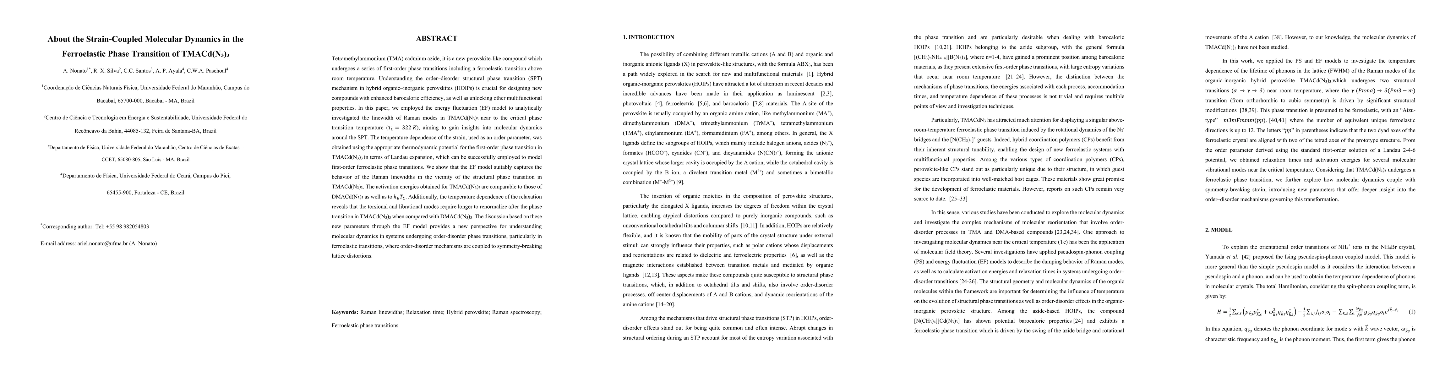 Tetramethylammonium (TMA) cadmium azide, is a new perovskite-like compound which undergoes a series of first-order phase transitions, including a ferroelastic transition above room temperature. Understanding the order-disorder structural phase transition (SPT) mechanism in hybrid organic--inorganic perovskites (HOIPs) is crucial for designing new compounds with enhanced barocaloric efficiency, as well as unlocking other multifunctional properties. In this paper, we employed the energy fluctuation (EF) model to investigate the experimental linewidth of Raman modes in TMACd(N$_3$)$_3$ near the critical phase transition temperature ($T_C = {322}{K}$), aiming to gain insights into the molecular dynamics around the SPT. The temperature dependence of the strain, used as an order parameter, was obtained using the appropriate thermodynamic potential for the first-order phase transition in TMACd(N$_3$)$_3$, expressed through a Landau expansion, which can be successfully employed to model first-order ferroelastic phase transitions. We show that the EF model suitably captures the behavior of the Raman linewidths in the vicinity of the structural phase transition in TMACd(N$_3$)$_3$. The activation energies obtained for TMACd(N$_3$)$_3$ are comparable to those of DMACd(N$_3$)$_3$, as well as to $k_B T_C$. Additionally, the temperature dependence of the relaxation reveals that the torsional and librational modes require longer to renormalize after the phase transition in TMACd(N$_3$)$_3$ when compared with DMACd(N$_3$)$_3$. The discussion based on these new parameters provides a new perspective for understanding molecular dynamics in systems undergoing order-disorder phase transitions, particularly in ferroelastic transitions, where order-disorder mechanisms are coupled to symmetry-breaking lattice distortions.