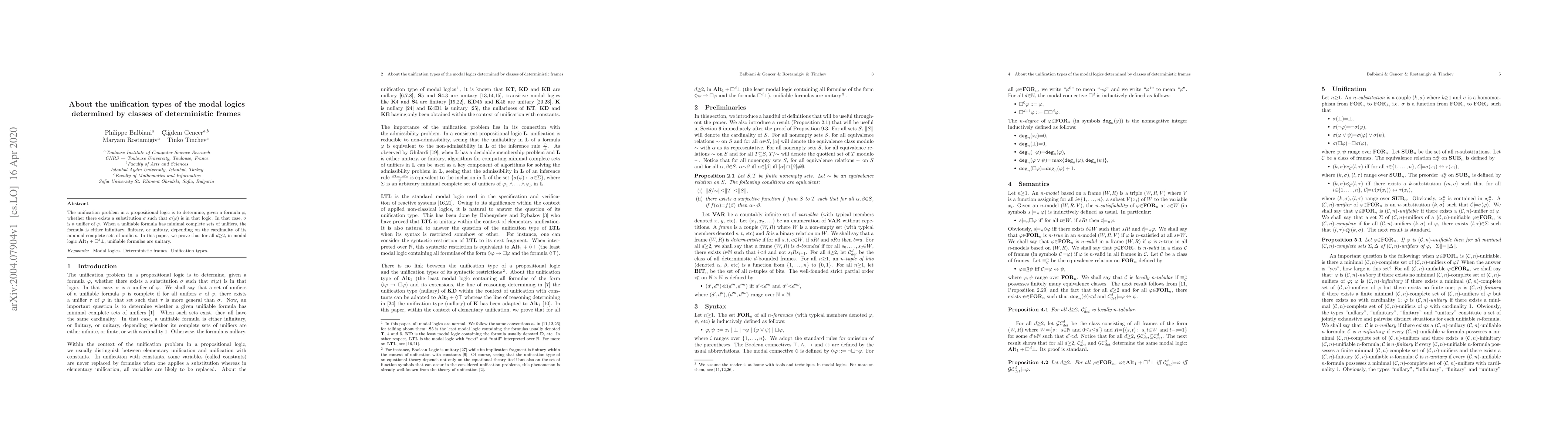 This paper investigates the unification problem within modal logics defined by classes of deterministic frames, focusing on the types of unifiers—infinitary, finitary, or unitary—that arise when formulas have minimal complete sets of unifiers.