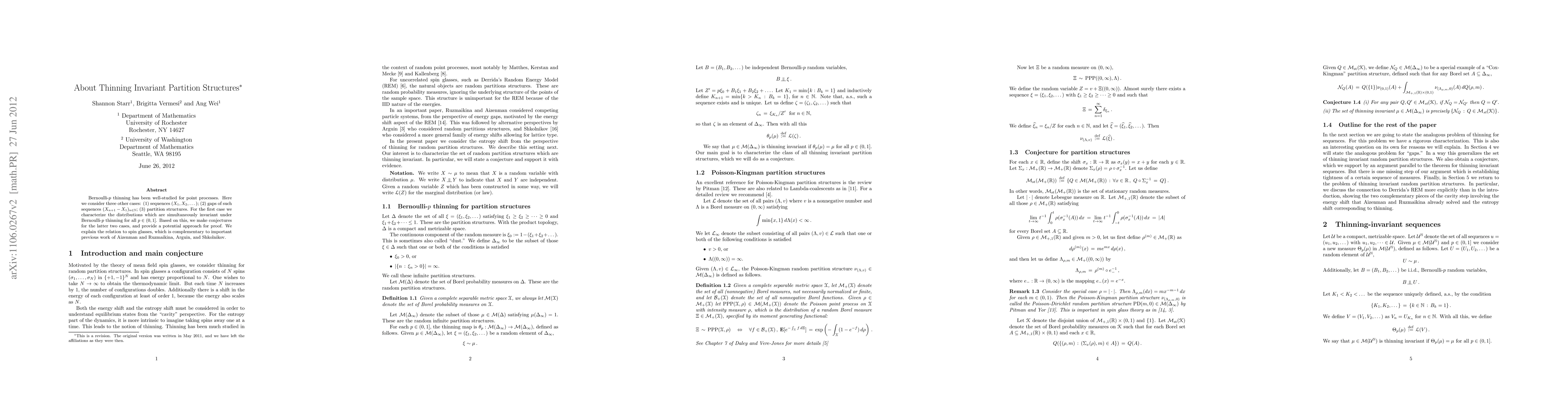 Bernoulli-$p$ thinning has been well-studied for point processes. Here we consider three other cases: (1) sequences $(X_1,X_2,...)$; (2) gaps of such sequences $(X_{n+1}-X_1)_{n\in\mathbb{N}}$; (3) partition structures. For the first case we characterize the distributions which are simultaneously invariant under Bernoulli-$p$ thinning for all $p \in (0,1]$. Based on this, we make conjectures for the latter two cases, and provide a potential approach for proof. We explain the relation to spin glasses, which is complementary to important previous work of Aizenman and Ruzmaikina, Arguin, and Shkolnikov.