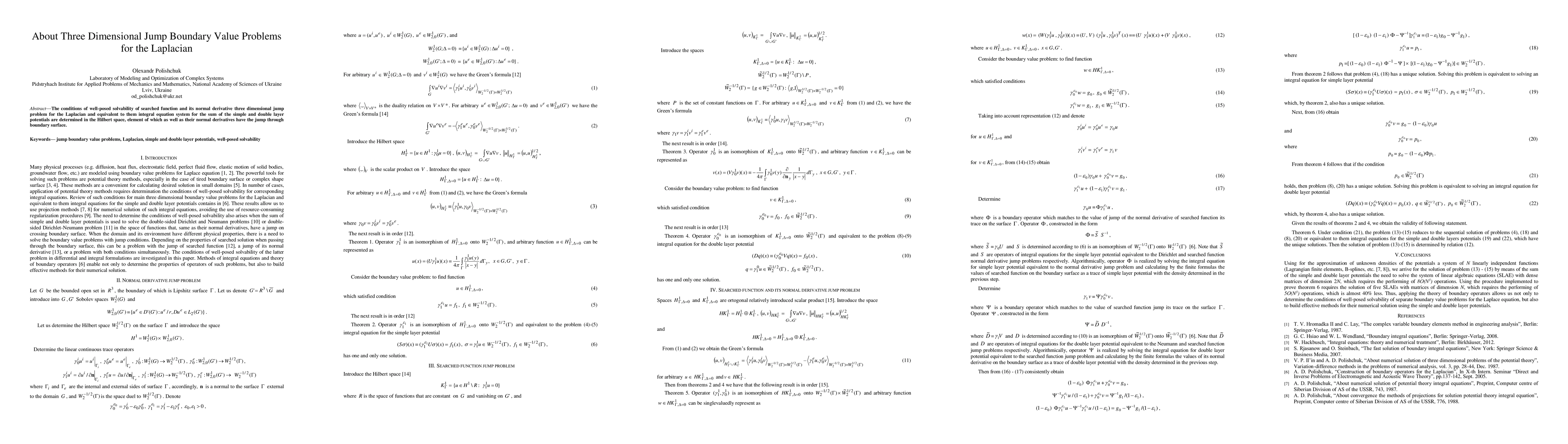 This paper investigates the well-posedness of three-dimensional jump boundary value problems for the Laplacian, focusing on the conditions for the solution and its normal derivative, and derives an equivalent integral equation system involving simple and double layer potentials.