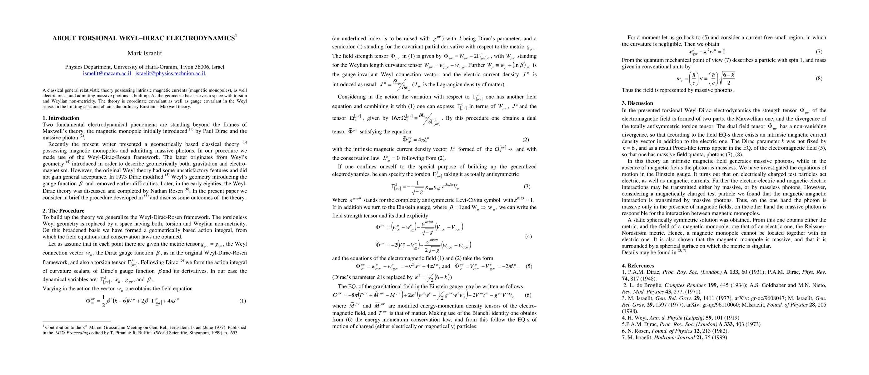 A classical general relativistic theory possessing magnetic currents, as well electric ones and admitting massive photons was built up. As the geometric basis serves a space with Weylian non-metricity and torsion. The theory is coordinate covariant as well Weyl-gauge covariant. In the limit one obtains the ordinary Einstein-Maxwell theory.